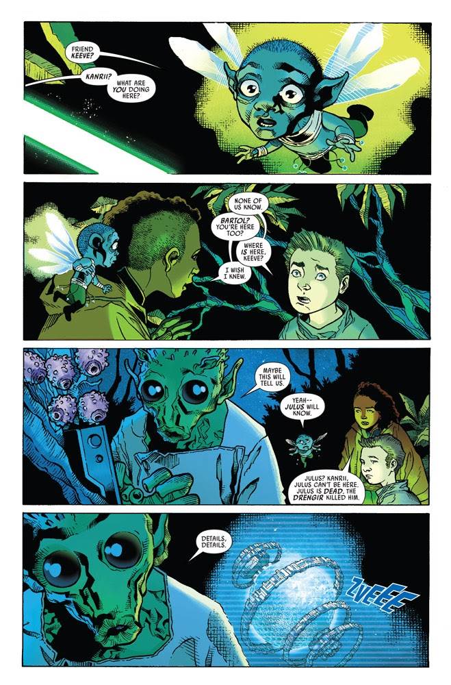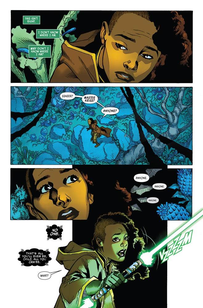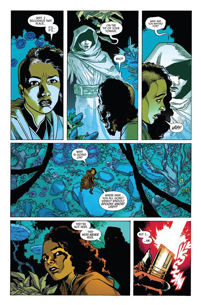 Still recovering from her bond with the Drengir root-mind, Trennis finds her meditation session aboard the Starlight Beacon disturbed by a series of strange encounters within the Force. First, characters she’s met in previous issues pop up to evidently guide her along the path she’s currently taking (recognize that Amaxine space station from The Rise of Kylo Ren and The High Republic - Into the Dark?). Then, Keeve interacts with an enigmatic figure clad all in white, followed by a menacing-looking alien in a dark robe who happens to brandish the crimson lightsaber from the cover. This could all be easily written off as visions implanted by the Drengir’s dark-side abilities in an effort to throw Trennis off course, but then the white-outfitted spectre turns out to be real and none other than Wayseeker Jedi Master Orla Jareni, first introduced in author Cladia Gray’s previously mentioned novel Star Wars: The High Republic - Into the Dark. Does this mean the Sith-esque character is real and alive somewhere in the galaxy at this point in the timeline as well? I have a feeling we’re going to find out eventually as this story continues in the coming months.