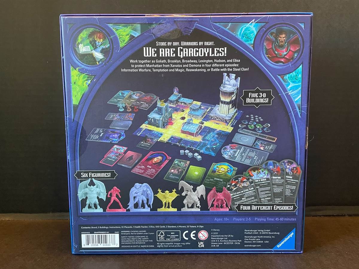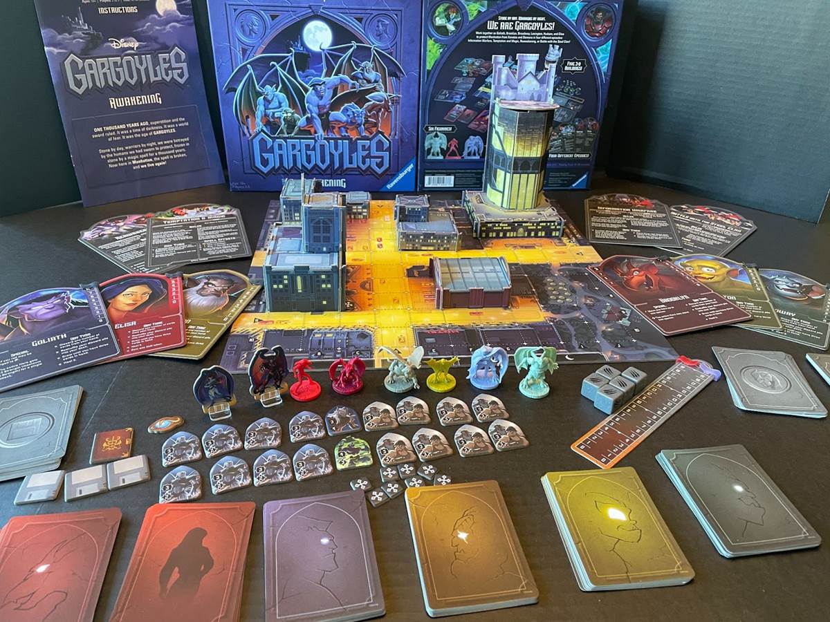 I was 10-years-old when I played my first board game based on Disney’s Gargoyles, but it was quite a bit different than this brand-new one that was just released by Ravensburger, Gargoyles: Awakening. The game I played as a child came with a VHS copy of Gargoyles the Movie: The Heroes Awaken, but it was made of thin paper and you had to be in front of a TV because it required the VHS to be playing to experience it. Funnily enough, 25-years later, this new game is recommended for ages 10 and up.