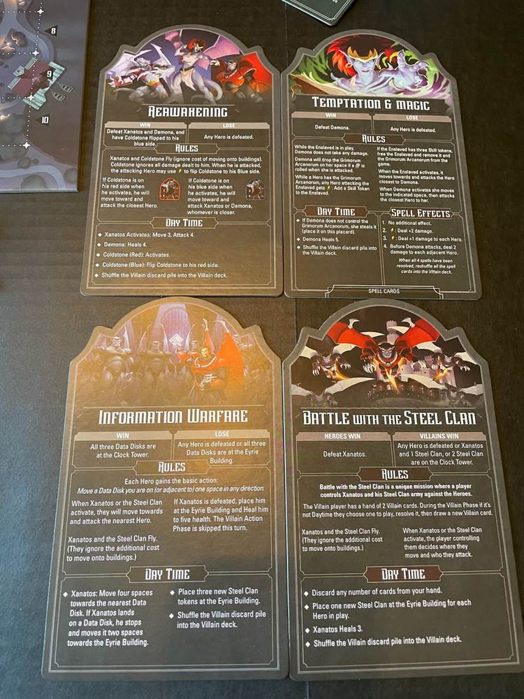 Playable by up to 5 players at a time, there are 5 heroes (Goliath, Brooklyn, Lexington, Broadway, Hudson and Elisa Maza) and two villains (Xanatos and Demona) and their minions. Each hero has their own deck of cards and a placard that is used to keep track of their health and special abilities.