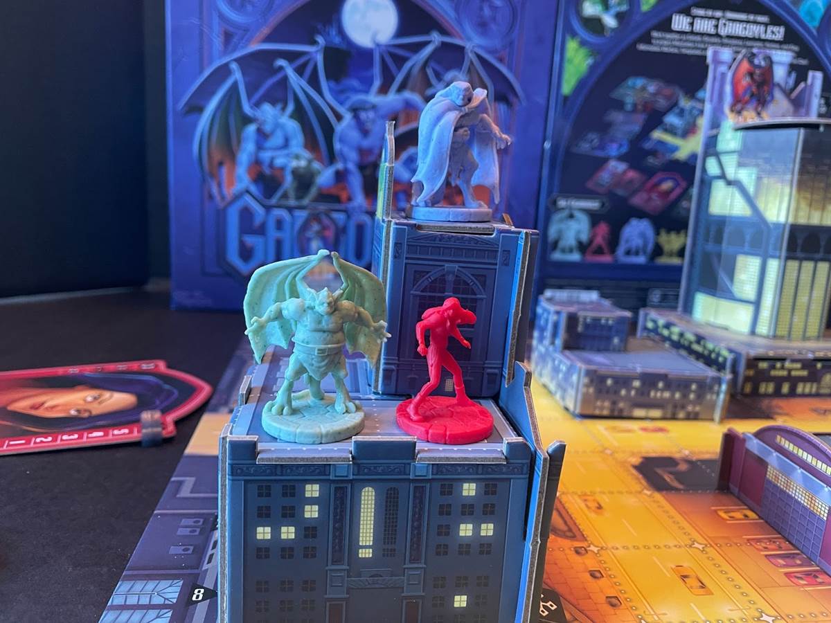 As with the TV series, the Gargoyles are active at night, but stone by day. The game starts with each hero taking a turn and performing the number of actions allowed on their placard, which also makes it easy to see how far they can move on a turn. When on top of buildings, heroes can also “Glide,” moving farther. Always holding no less than three cards in their hand, they can also use cards when the time is right.