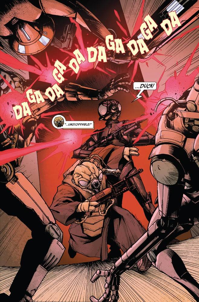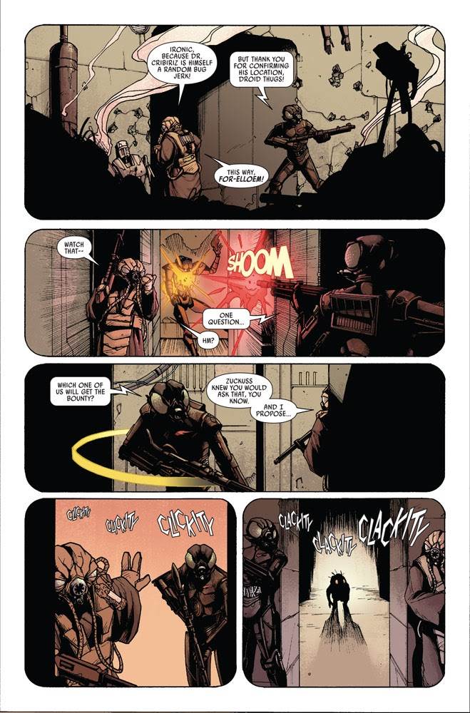We get flashbacks to one of 4-LOM and Zuckuss’s first missions together, when they worked for newly introduced bounty hunter Deva Lompop to track down and eliminate an insectoid droid mechanic / warlord named Cribiriz Idollax, a task that ends with the twosome discovering which of their complementary skills makes them so successful as a partnership. Back on Tatooine, writer Daniel José Older (writer of the Han and Lando novel Star Wars: Last Shot) has the opportunity to reintroduce ex-stormtrooper Sardis Ramsin from his short-story entry in the anthology collection Star Wars: From a Certain Point of View, and through that character we get a roundabout reunion between the two title characters.