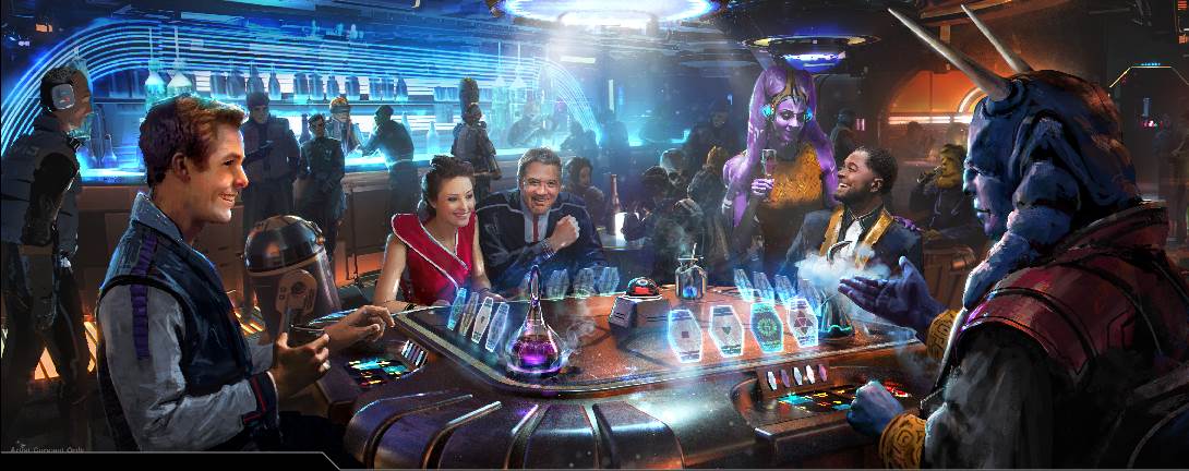 - The Sabacc tournament: Similarly, it’s been a dream of mine since I was fairly young to sit around a table and gamble with the scum and villainy of the galaxy, much like how Han Solo won the Millennium Falcon from Lando Calrissian in that fateful card game. In the concept art above, the sabacc seems to be played using a hologram-type technology rather than with a paper deck, but I understand how that might better reflect the high-class nature of the Halcyon ship we’re traveling aboard. It should be interesting to watch guests around you gradually learn the rules of this game that’s been part of Star Wars lore for decades, and then hopefully become proficient enough to whittle down the competition.