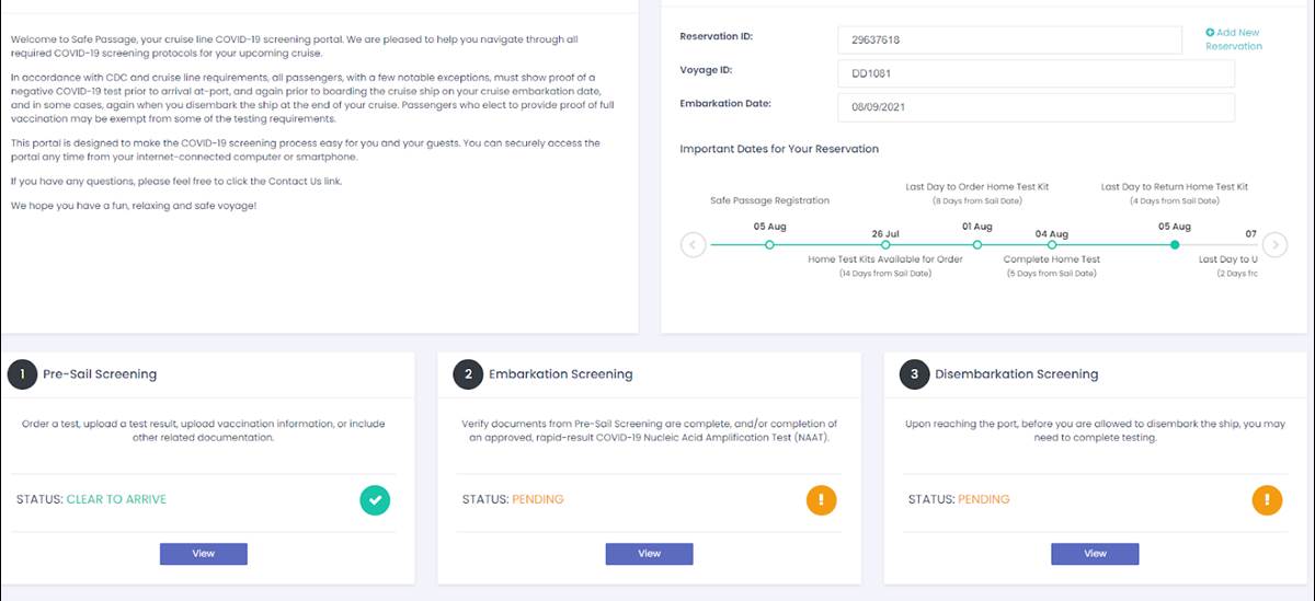 So, prior to sailing, we had to get all of our testing/vaccination documentation to Disney. Disney uses the Safe Passage website to track all the documentation. To register, I entered my reservation number, name and birthdate. That allowed me to create an account with my email address. I then entered and/or verified other information like my address and stateroom number, and I was registered. Each adult needs to create their own account. Any minors can be attached to one of the adult accounts.