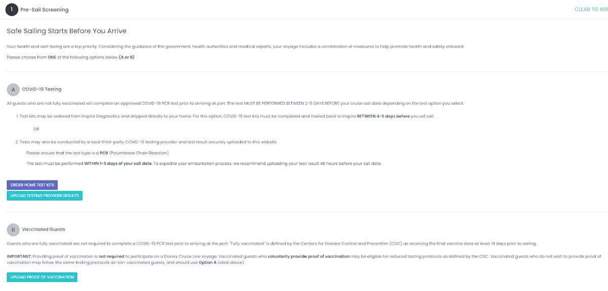 - Embarkation COVID-19 Testing: Guests are required to undergo a rapid PCR COVID-19 test administered by Inspire Diagnostics at the terminal prior to boarding. Guests with positive COVID-19 test results, as well as those in their travel party, will be denied boarding. The $65 test fee will be charged to the folio of all Guests 12 years and older. Disney Cruise Line acts as the paying agent for Inspire Diagnostics and will remit the entire cost of the COVID-19 test to Inspire Diagnostics. Guests who are fully vaccinated may choose to provide proof of vaccination instead of undergoing COVID-19 Embarkation Day testing.