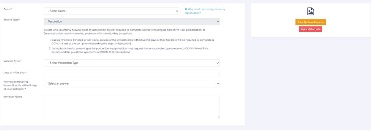 Guests who choose to show proof of vaccination instead will see a similar screen where they can enter their vaccination type, the date or dates they received them and upload their proof.