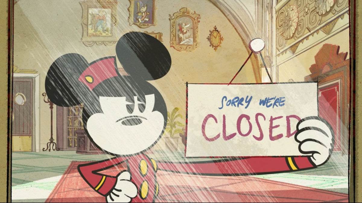 Mickey, Donald and Goofy have taken jobs as bellboys at a San Francisco hotel that is down on its luck (the lobby of which looks a lot like The Hollywood Tower Hotel from Twilight Zone: Tower of Terror). The owner is about to close the hotel due to a lack of business and decides to leave the trio in charge. Goofy points out that he doesn’t understand why nobody comes in because the sign on the door says “Open.” Mickey is the one who realizes that it’s backwards and flips it around.