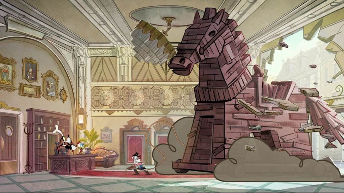 Just one heart remains to be found and it shows up pinned inside a medieval torture device from the museum, which chases after Mickey and Minnie. They both end up cornered down an alley.