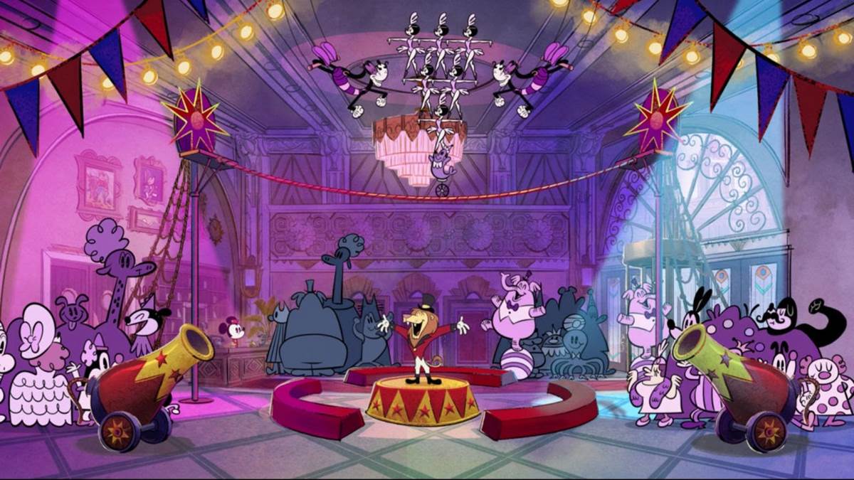Almost immediately, a small car screeches into the lobby and a lion pokes his head out, asking if they have rooms and room service. When Mickey says yes, he opens the door and an entire circus of performers get out, including two pink elephants (they don’t look like the ones from Dumbo, but I imagine there’s a connection here).