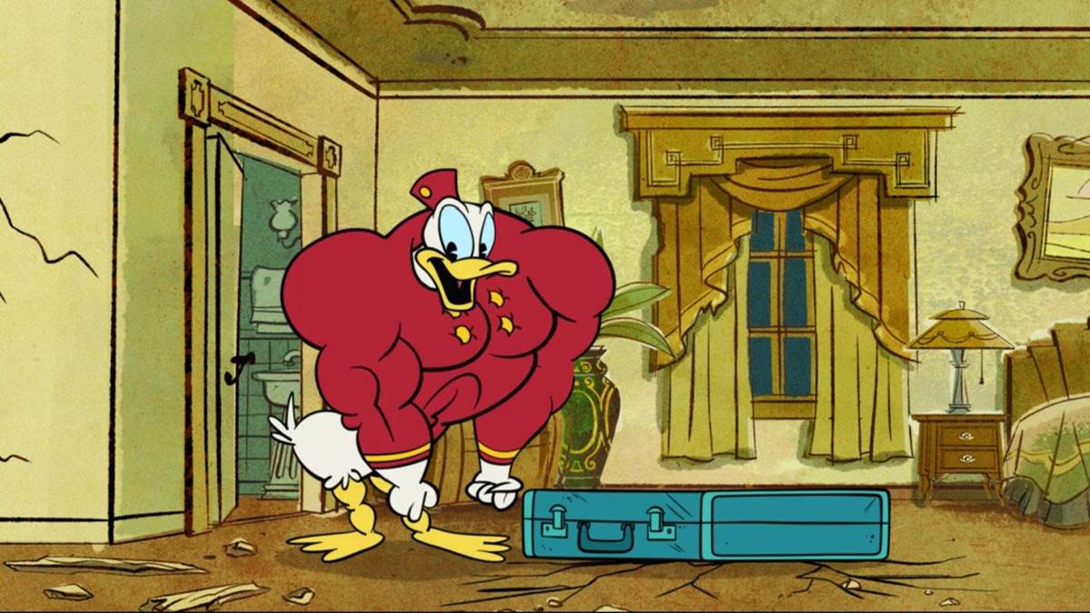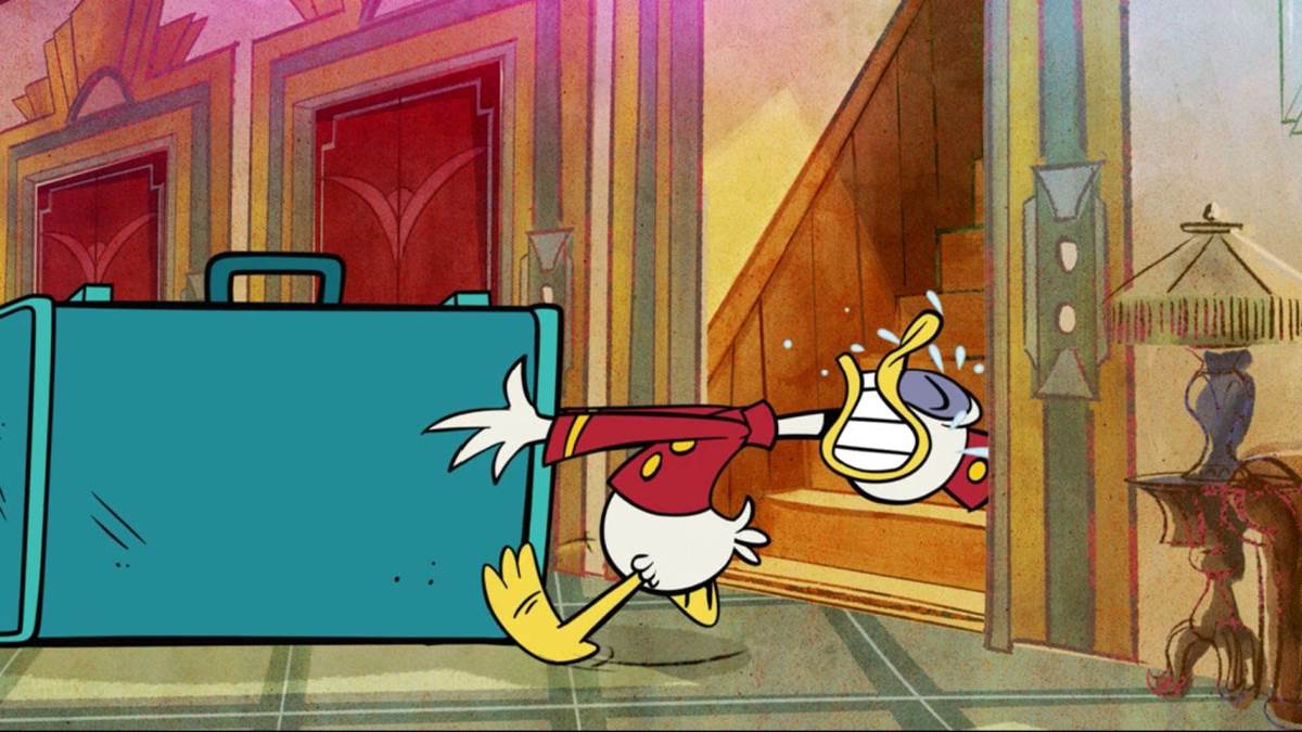 While Mickey fields complaints from the ringleader lion about the long wait for room service, Donald manages to finally get the gorilla’s suitcase up the stairs. He looks swole at first, but quickly deflates, exhausted on top of the suitcase. The floor begins to crack and Donald is about to go for a ride all the way down through the hotel’s many stories.