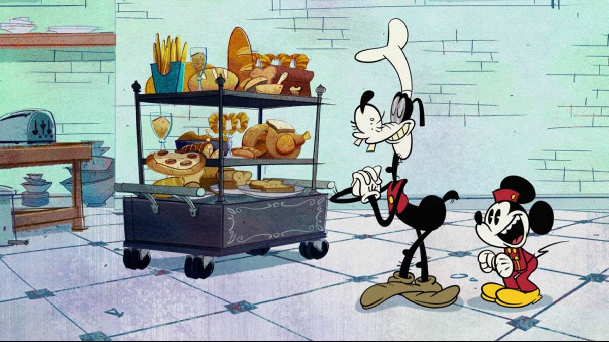 Mickey takes food orders for Goofy, who reveals that the only food on hand is bread. Mickey stalls by checking in on the rooms but when he gets back to the lobby, he finds himself literally thrown into the circus act.