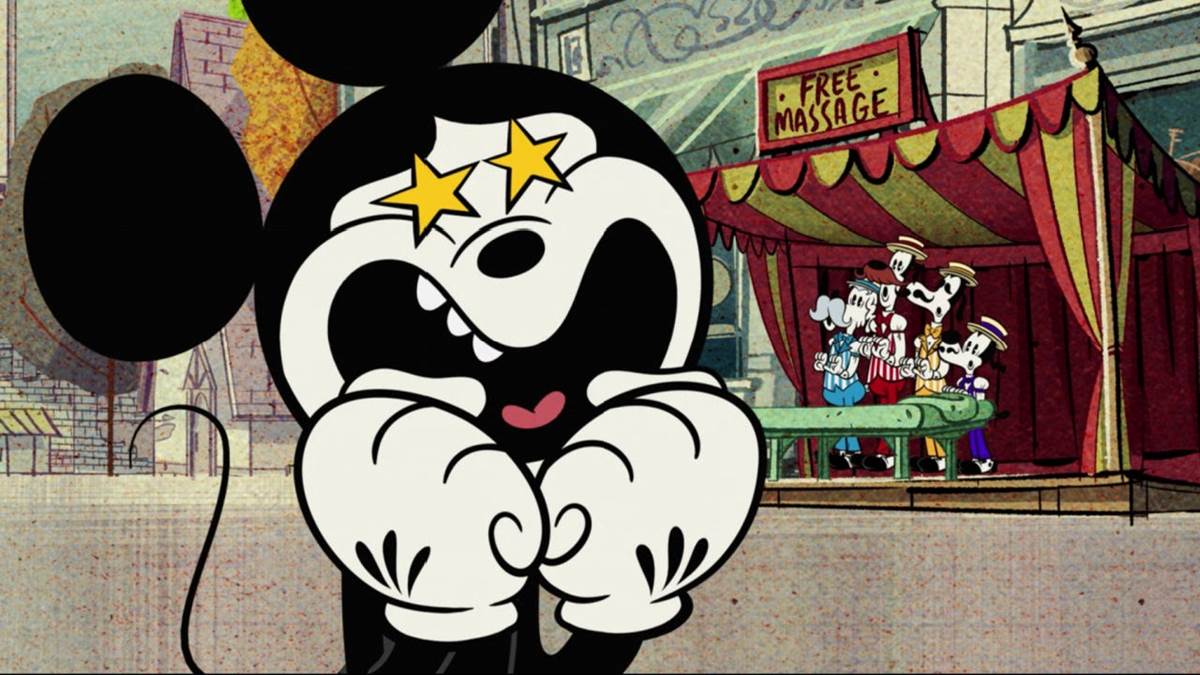 Once again, Mickey is oblivious as a new barbershop quartet appears, this one also giving massages as they sing.