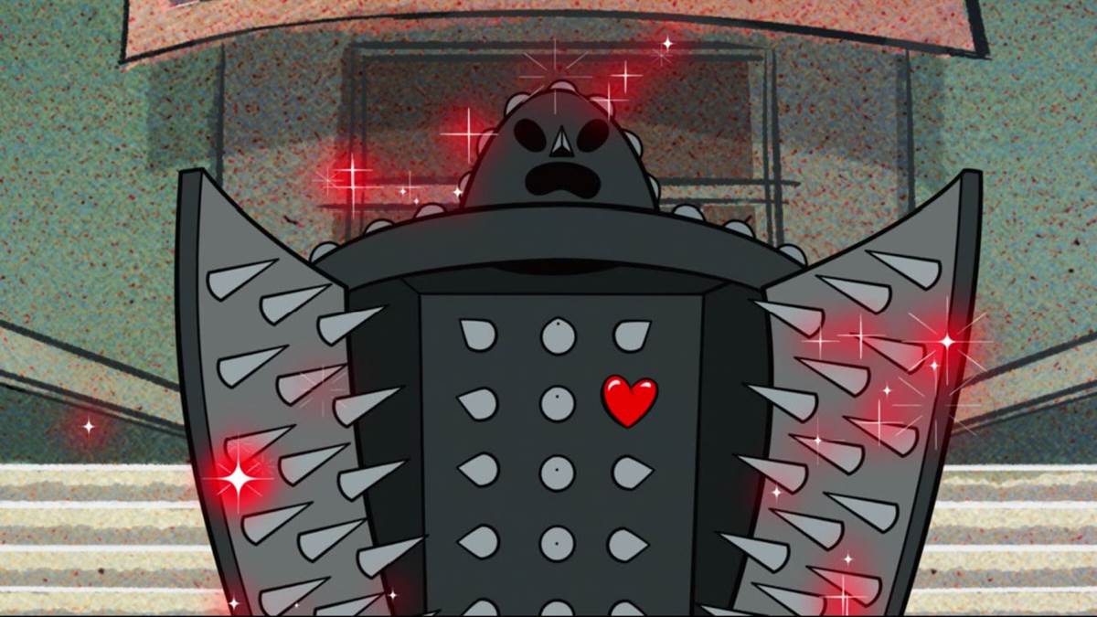 Mickey is able to talk the torture device into calming down and while he does so, Minnie punches her fist through the back, grabs the heart and combines it back together. This time, she opens up her chest, puts Mickey’s heart inside, and locks it with several different methods.