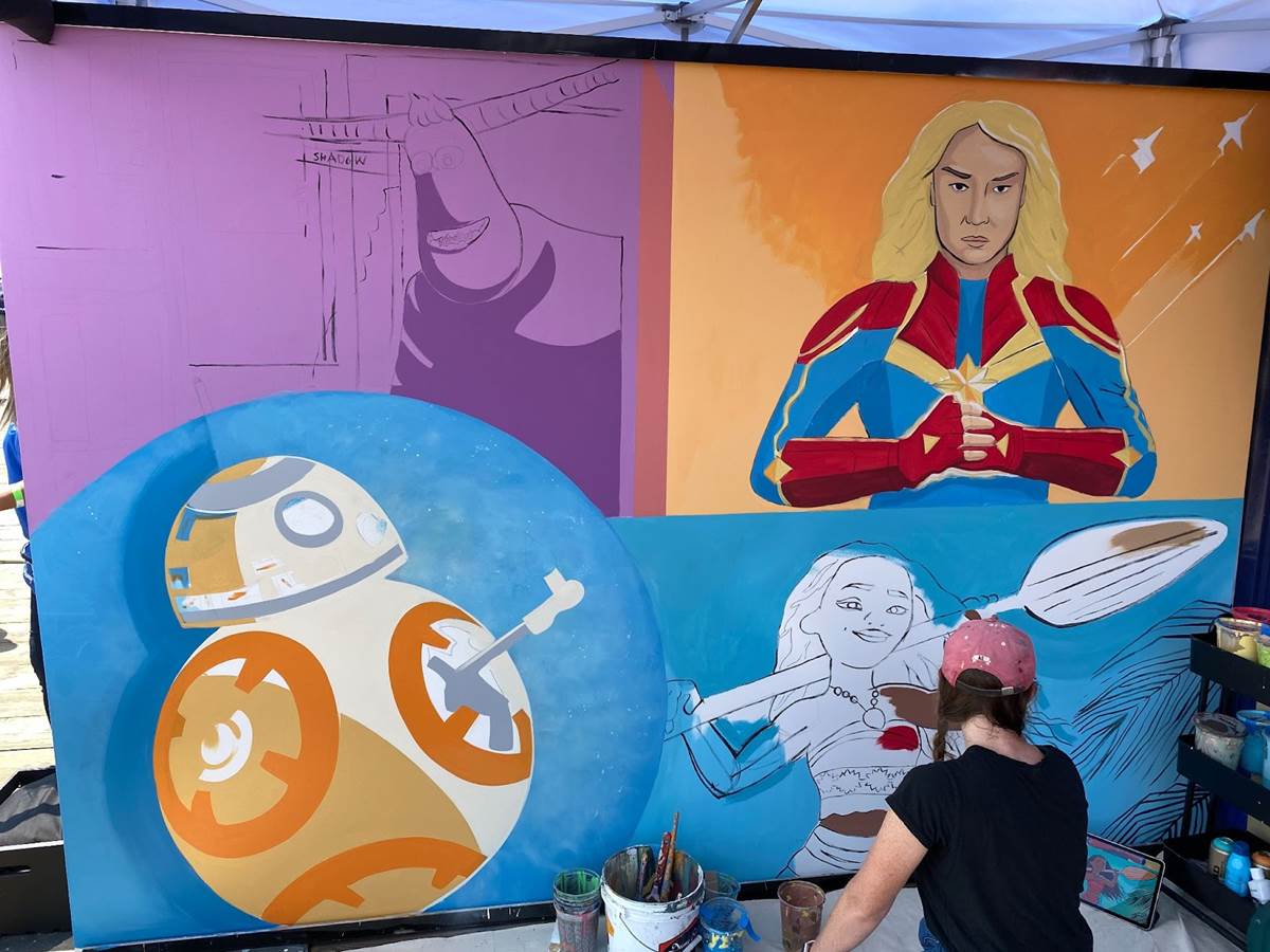 Perhaps the most memorable sights to see in “Disney+ The Stories Continue” were the display cases containing costumes and props from Cruella, High School Musical: The Musical: The Series, The Mysterious Benedict Society, The Mandalorian, and Loki. There were also fun oversized Disney+ magazines being distributed to guests of the experience, and a mural depicting recognizable characters from Monsters at Work, Captain Marvel, Star Wars: The Force Awakens, and Moana being painted live in person.