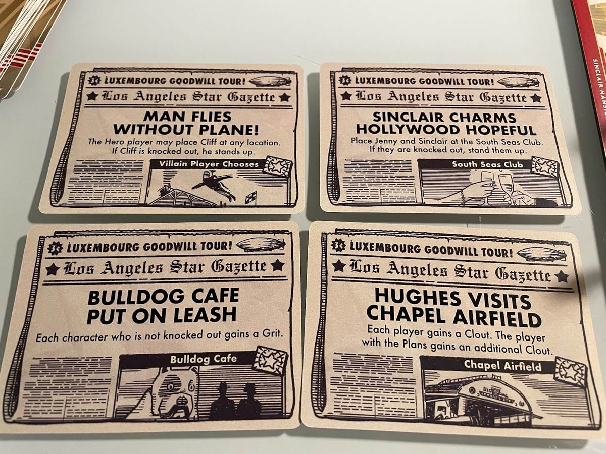 Once all three characters have played through a turn, a new “Current Events” card is drawn, which looks like a newspaper headline. Each card can move the Luxembourg closer to Los Angeles, comes with a new scenario that applies to all players, and adds an incentive for taking control of a location at the end of the new day in the form of a bonus card in play from that player’s deck.