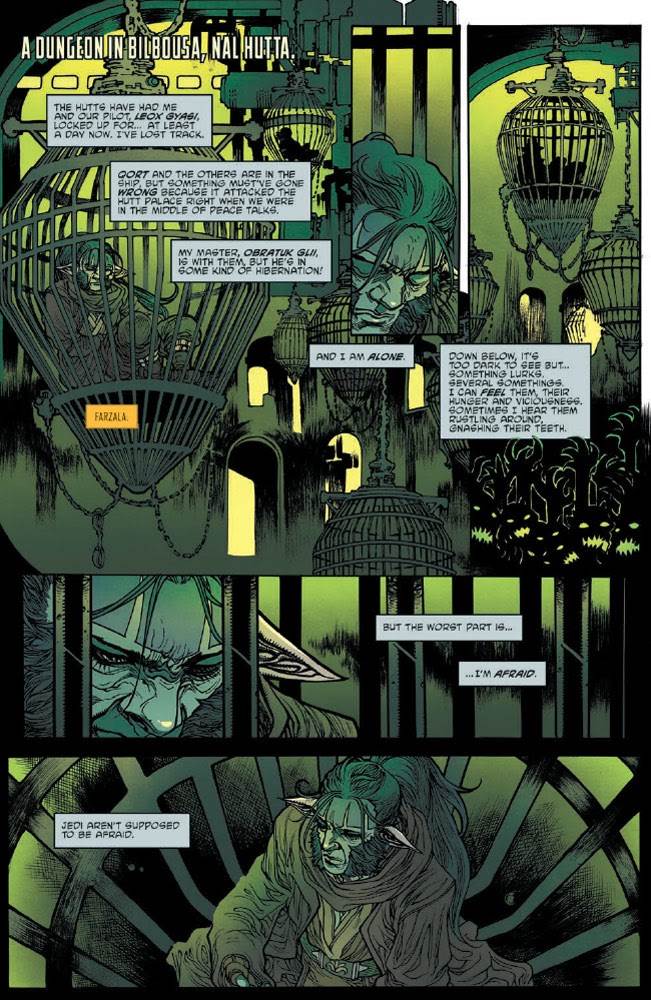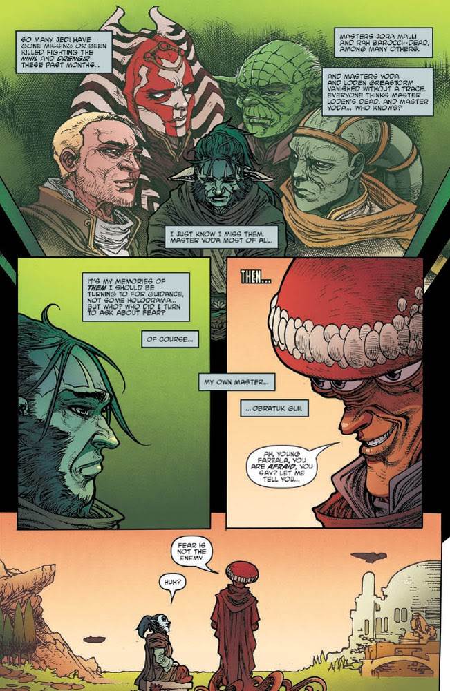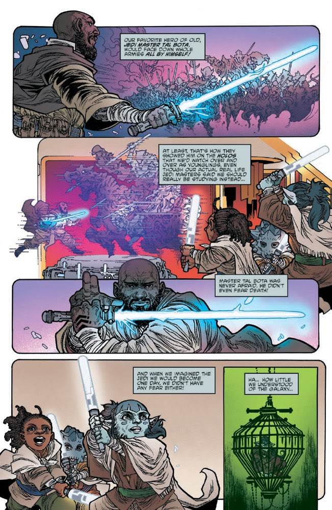 In issue #7 of The High Republic Adventures, Older continues to prove that he knows what makes Star Wars fun. The story opens where the previous installment left off, with Jedi Padawan Farzala Tarabal having been captured and imprisoned on the Hutt homeworld of Nal Hutta. As a by-product of meditation, Farzala flashes back to his training under Master Obratuk Glii of the fungi-like Parwan species and to a series of holovids he watched as a youth depicting the adventures of an ancient Jedi Master named Tal Bota-- who happens to bear a striking resemblance to Older himself. Tarabal ruminates on the nature of fear and puts his memories to good use in breaking free of his cage, wrangling one of the local creatures, and bringing the Hutts back around to his side thanks to the help of pilot Leox Gyasi and Skarabda the Hutt’s Nikto head of security named Ishnar.