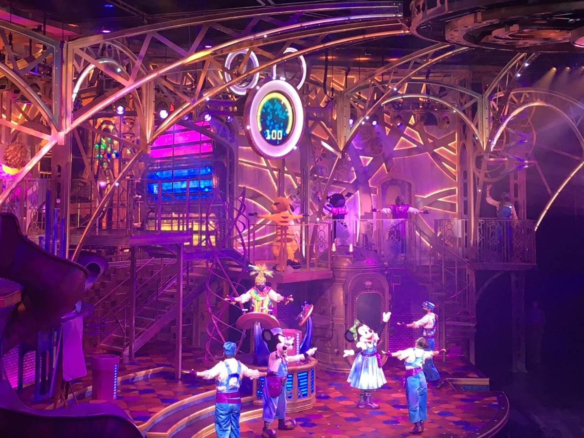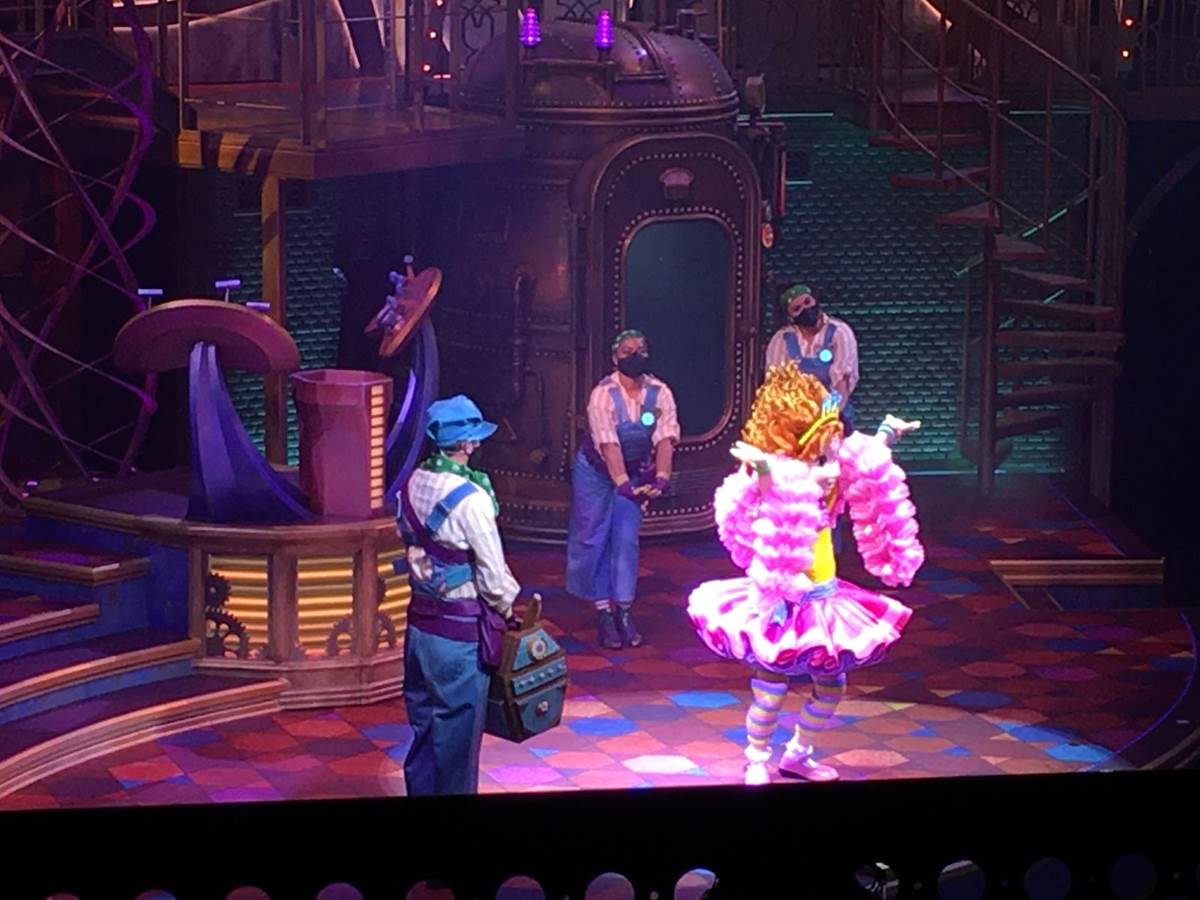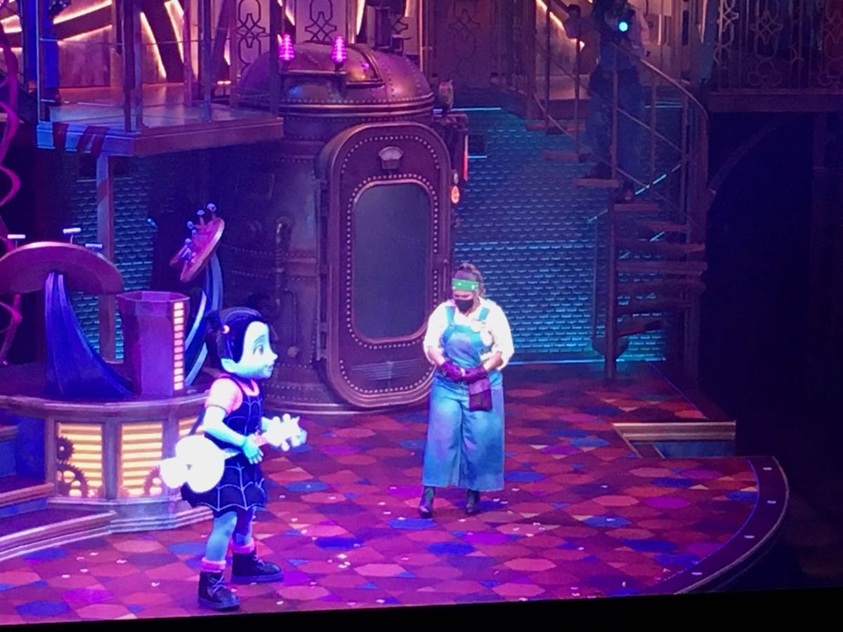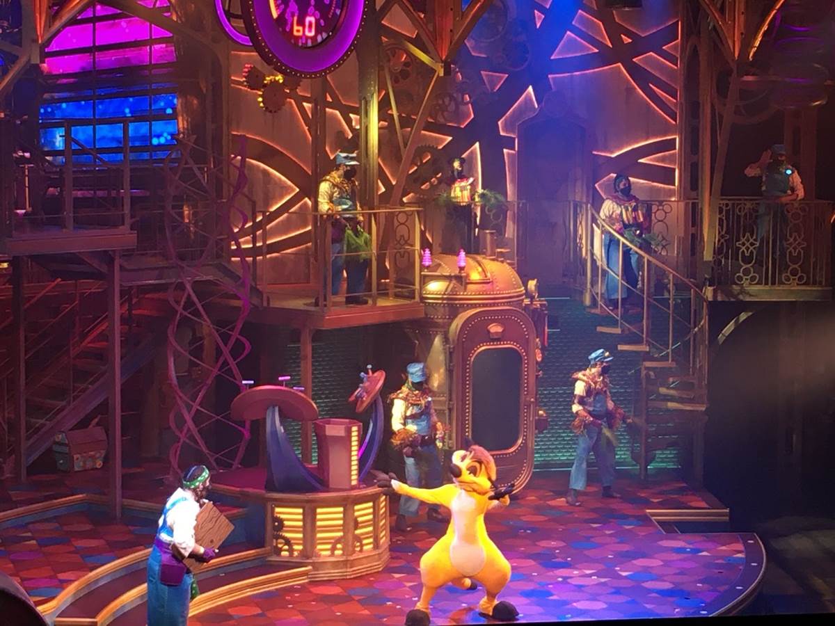 The stage and theatre is beautifully designed to be a steampunk “Dream Factory”, and the show begins with a crew of dream technicians running the factory. However, it turns out that a number of people in the room don’t have a dream – so they enlist the help of Mickey and Minnie. The show moves on to address different dreams: the dream to be fancy (to which Fancy Nancy Clancy makes an appearance to restore the dream), the dream to be a rockstar (to which Vampirina comes to the rescue) and the final dream being to dance and have fun (to which Timon comes in to show off his dance moves).