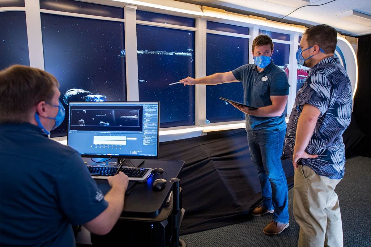 Out of everything I got to see as I toured the WDI offices of Walt Disney World, nothing was more exciting or awe inspiring than walking in to see the virtual “window” that will be the centerpiece of the Star Wars: Hyperspace Lounge. Growing up in the 70s/80s, I was in the Golden Age of Star Wars. So the idea of sitting at a bar and looking out into space to see a Star Cruiser fly by has always been a dream of mine and the Hyperspace Lounge will be where that dream can become a reality (virtually). Having the chance to stand in the room and watch ships flying by, learn about the technology that will be in the lounge, and talking to the creative minds behind this really took my childhood dream to the next level. One of the most interesting parts of the “window” will be the Easter Eggs that will pop up from time to time, including a Star Speeder direct from Star Tours flying past or perhaps the best view in the galaxy the Halcyon Starcruiser on its two-night cruise from just outside Disney’s Hollywood Studios.