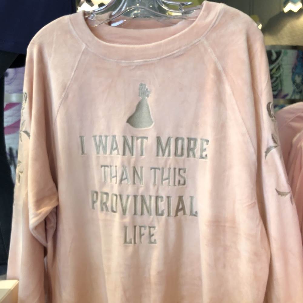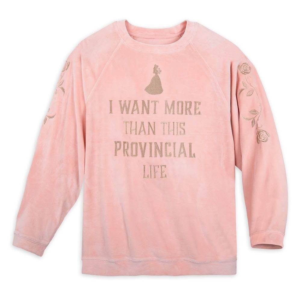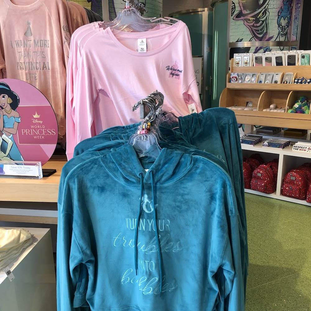 I’m partial to the flowy t-shirt and velour sweatshirt featuring Belle and a couple of her most famous quotes. Add in all the little icon details and you have something truly enchanting! You can also find these looks at DisneyStyle at Disney Springs.
