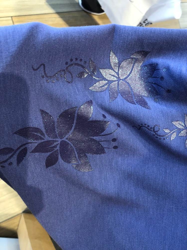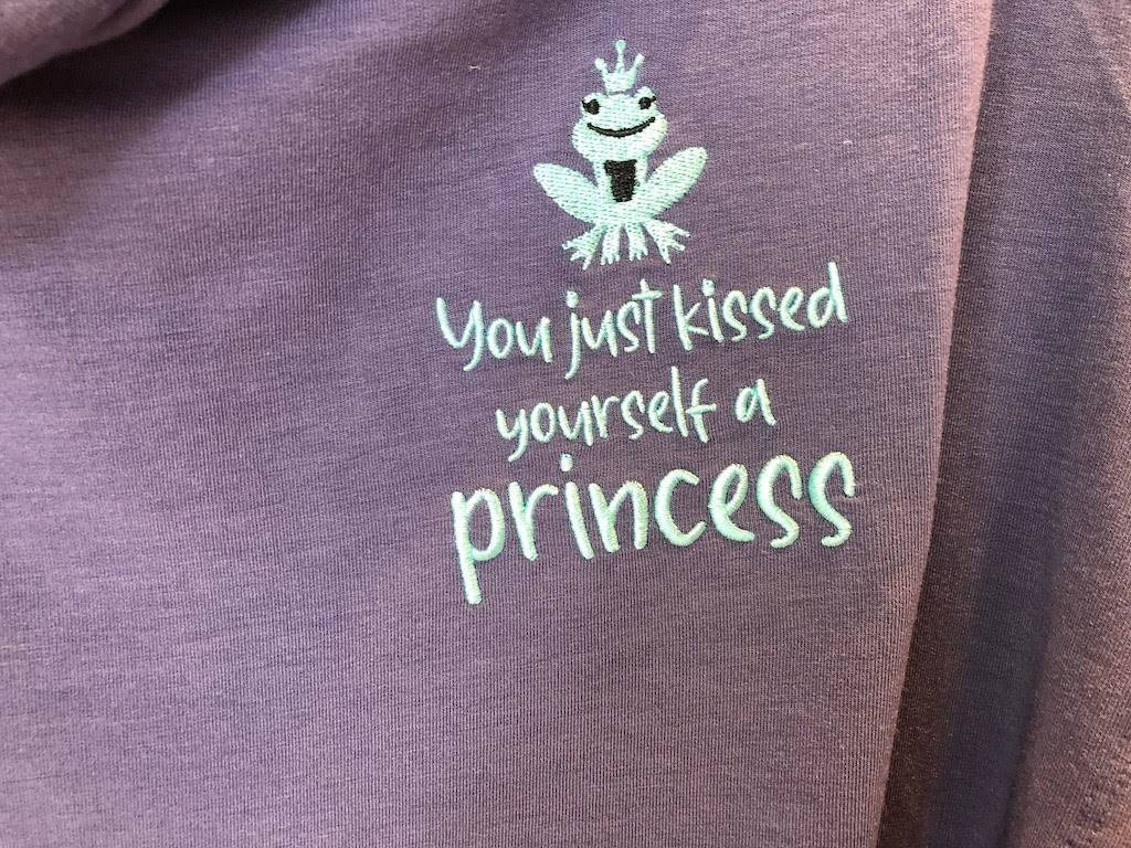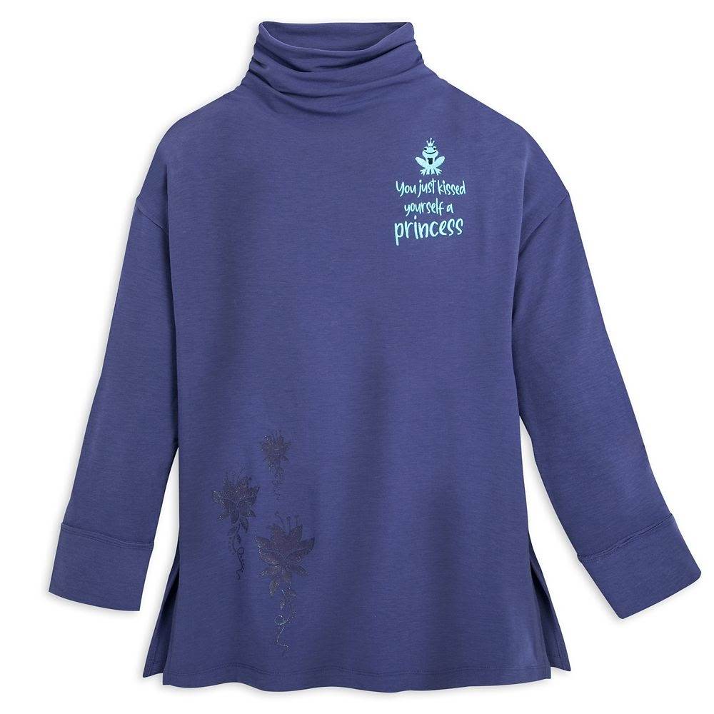 Tiana serves as the inspiration for this purple cowl neck top that features an adorable frog on the left shoulder. On the bottom right are lilies that sparkle under the light.