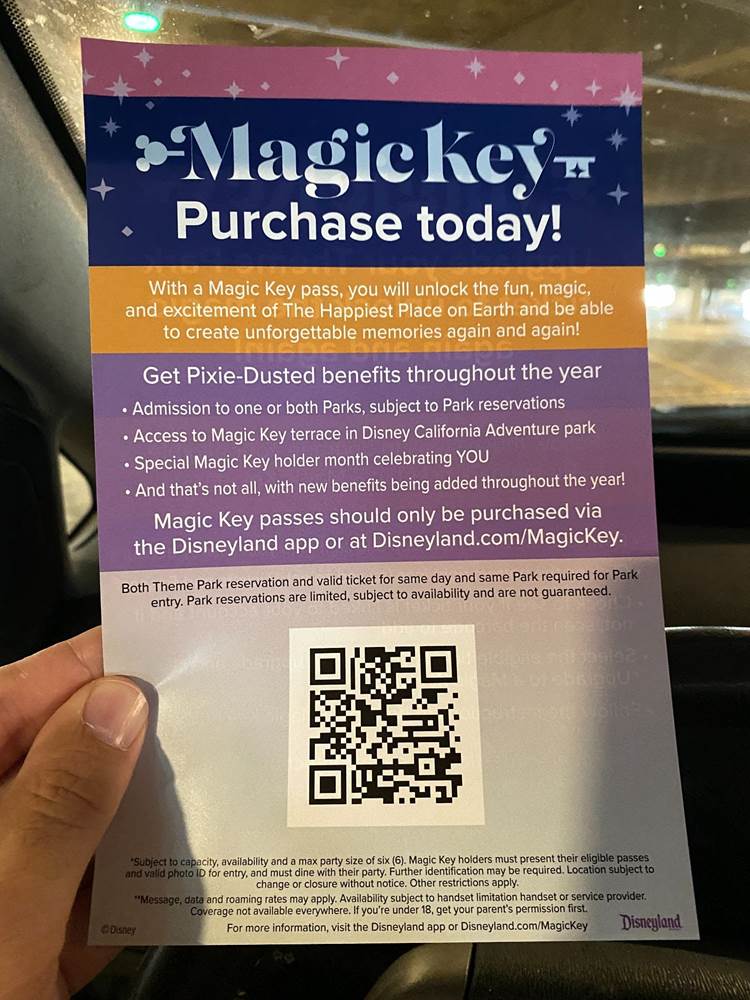 Upon arriving at the Mickey & Friends parking structure yesterday morning, I was handed the above two-sided flyer by the booth attendant. One side provided information on how to upgrade a theme park ticket to a Magic Key, and the other side displayed details about what benefits were included in the Magic Key itself. Unfortunately, in trying to follow the upgrade instructions right away as soon as I had parked, I found that the app on my iPhone wasn’t quite working as detailed on the flyer-- I got through the first three steps but once selecting the eligible ticket, there was no button to “Upgrade to a Magic Key pass.”