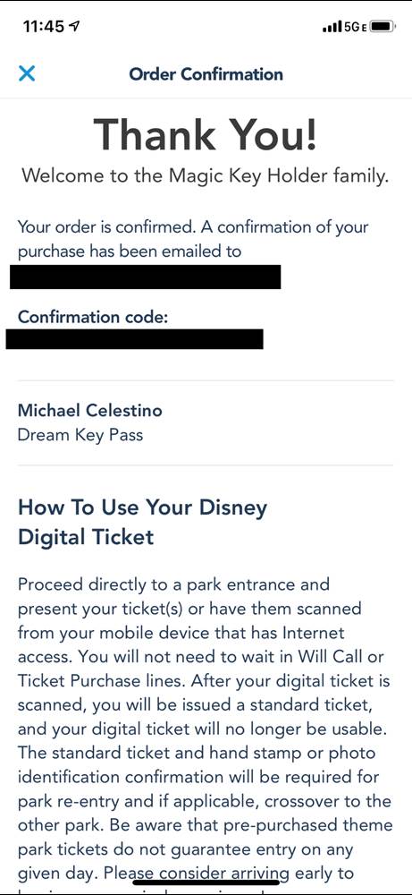 I immediately received a confirmation, was asked to input some additional personal details such as my address and phone number for the new Magic Key account, and then I saw that my parkhopper had instantly been modified to the “Dream Key Pass” Magic Key in the “Tickets and Passes” section of the app, complete with scannable barcode for entry into the parks and a link to the “Access Calendar” blockout dates.