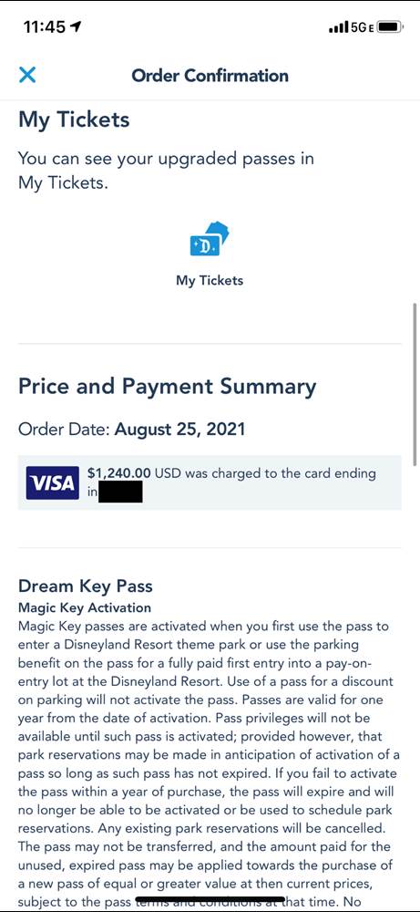 What I was eventually able to figure out, thanks to the help of some of Laughing Place’s Twitter followers, was that current ticketholders had to first enter the park before the app would allow them to upgrade to a Magic Key. I was surprised to find that even Cast Members posted in the Disneyland Resort esplanade didn’t seem to be aware of this step in the process, as the one I asked simply told me to wait until the app eventually updated itself. Fortunately I took Twitter’s advice, stepped through the Disneyland main gate after having my ticket scanned, and was immediately able to upgrade, as evidenced by the above screenshots. The app applied the $159 I had spent on a single-day parkhopper ticket and gave me the option to purchase one of the four Magic Key tiers-- Imagine Key, Enchant Key, Believe Key, and Dream Key. Choosing the Dream Key, my new total came to $1240 after the deduction.