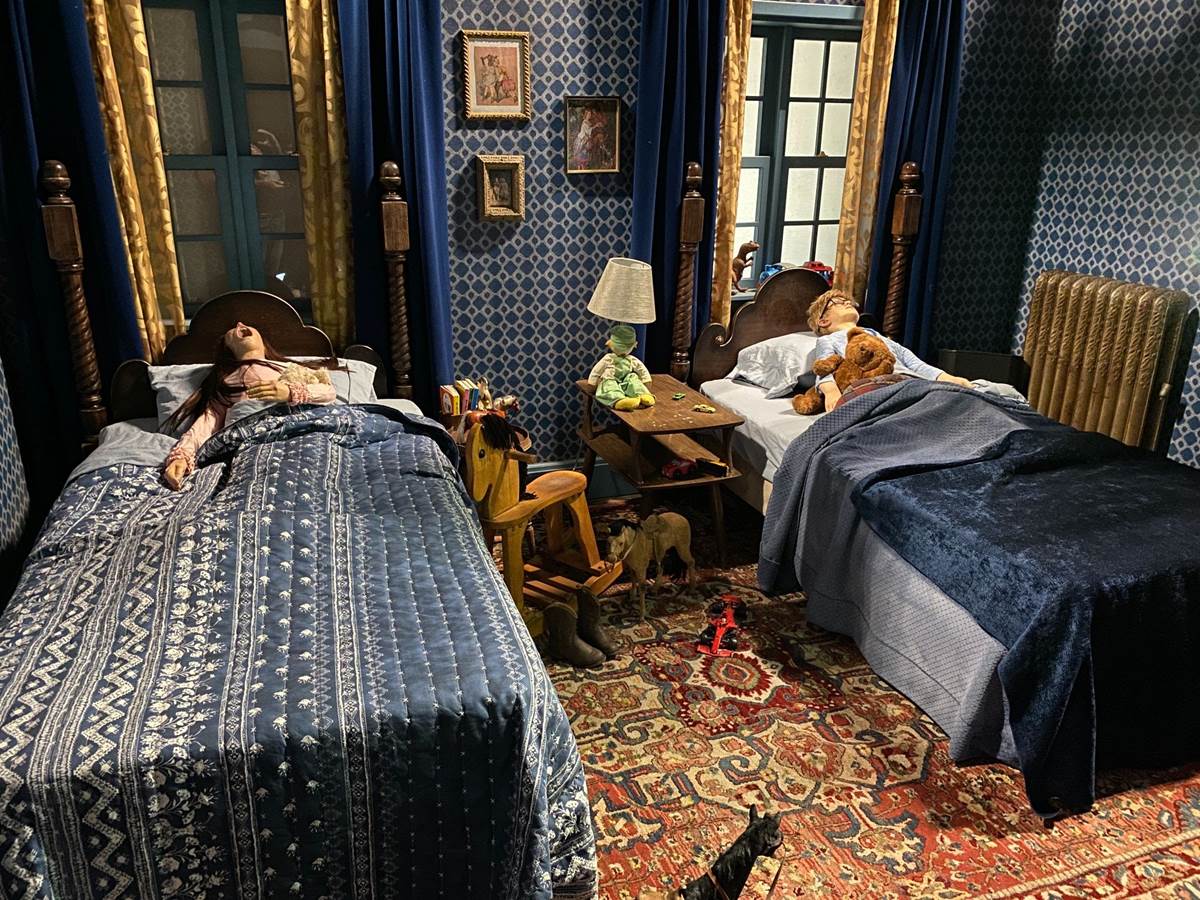 “There’s a couple big challenges in this maze,” says John Murdy as we step through the facade. “One is just the house itself, because when you look at that set [on the show], they built it practical. Trying to convert that enormous two-story house into a maze at Halloween Horror Nights reminded me of working on Guillermo del Toro’s Crimson Peak in 2015. It was a similar challenge. The other challenge is the character of the Bent-Neck Lady herself. When you design something like this, you of course think about the aesthetic, but you also have to think about the ergonomic. Is it reasonable to ask an actress to do that [with her neck] for seven or eight hours a day? No, it’s not. So we did a science project to figure out how we can get the look of that extreme broken neck, but still have it be a live performer? Our makeup artist Patrick McGee invented this figure that the actress actually wears. It’s a hybrid costume/mask, but also has an artificial head. Mike Flanagan, the creator of The Haunting of Hill House, was down last week to check out the maze, and his reaction was, ‘I almost feel like I’m on the set again.’”