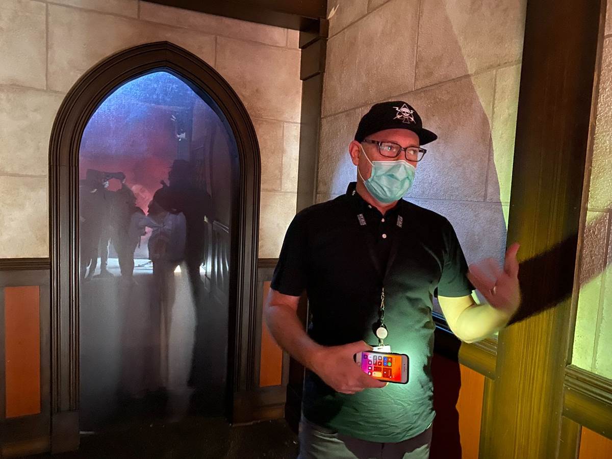 “There’s something the show did that I thought was really interesting, and it was the juxtapositioning of time,” says Murdy as he shows off some of the scrim lighting effects that will be used to make ghosts appear behind the house’s walls. “There’s two timelines that Hill House exists in-- the past and the present. What I really liked about what Mike did in his direction is you could be in a scene in the past and they’re walking down the hallway, and then they turn the corner and they’re in the present. We wanted to somehow replicate that [in the maze].” Murdy also talked about the advantages of doing Halloween Horror Nights during the streaming revolution. “When we started working with Netflix for Stranger Things, I knew that they were going to invest big in horror, so I knew that this was a company we were going to want to start working with. As more of these streaming services start coming online, it’s creating more opportunities, which is fantastic for us. After 15 years of doing this, you get to a point where you’ve done most major franchises in horror. There’s not a lot of properties that are on my bucket list that I had back in the beginning that we haven’t done. Netflix is doing a lot of horror, which is great.”