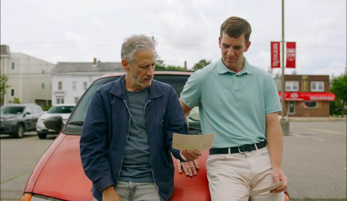 Eli shares a description of the first game from the then Rutgers newspaper, which likened the sport to soccer. That leads to a conversation about Stewart’s time as a college soccer player. They then get dressed in period-appropriate garb and test out their kicking abilities with a ball similar to what they used in that first game. Eli makes the best joke of the episode by telling Stewart not to worry about hitting a car because Peyton is his brother, so naturally he has more insurance than anyone.