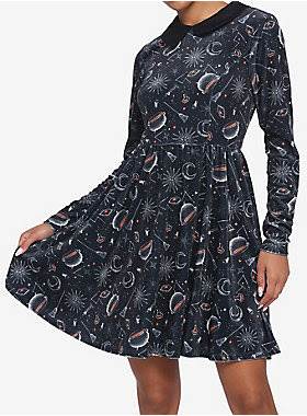 Embrace the spirit of Halloween with this black, orange, and yellow sweatshirt that looks like a sweater, or with the long sleeve collar dress. The dress pattern features broomsticks, moons, cauldrons, stars and more, has pockets and is available in standard and plus sizes.