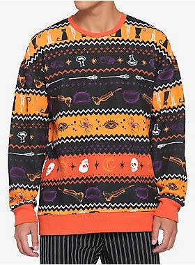 Embrace the spirit of Halloween with this black, orange, and yellow sweatshirt that looks like a sweater, or with the long sleeve collar dress. The dress pattern features broomsticks, moons, cauldrons, stars and more, has pockets and is available in standard and plus sizes.