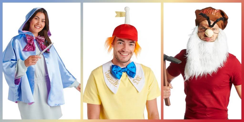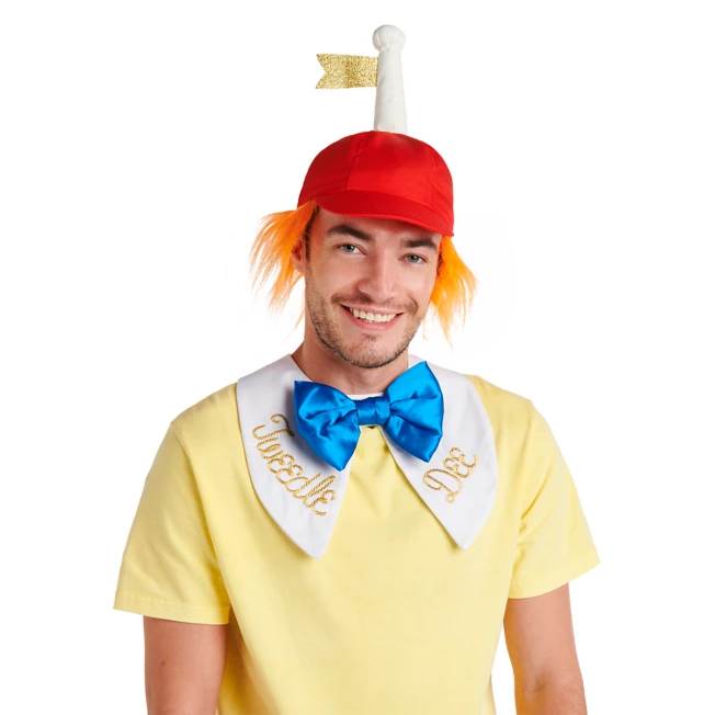 Pair a basic tee with shopDisney’s Tweedledee or Tweedledum costume accessory set which includes the character’s familiar red beanie, wild orange hair, bright blue bow tie and reversible embroidered collar.