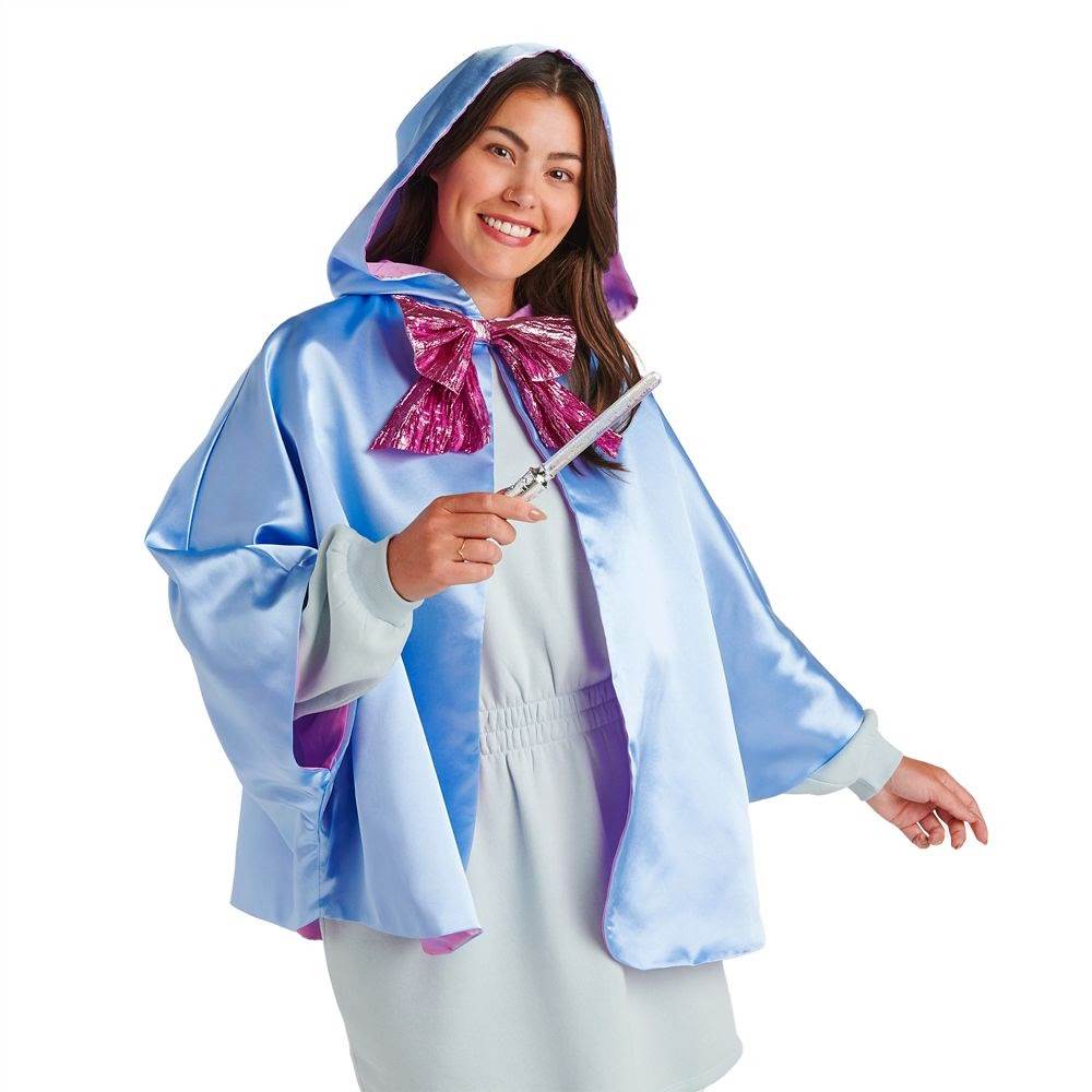 With just a little more than the wave of a wand, transform yourself into Cinderella’s Fairy Godmother thanks to this baby blue capelet with hood and signature big pink bow.