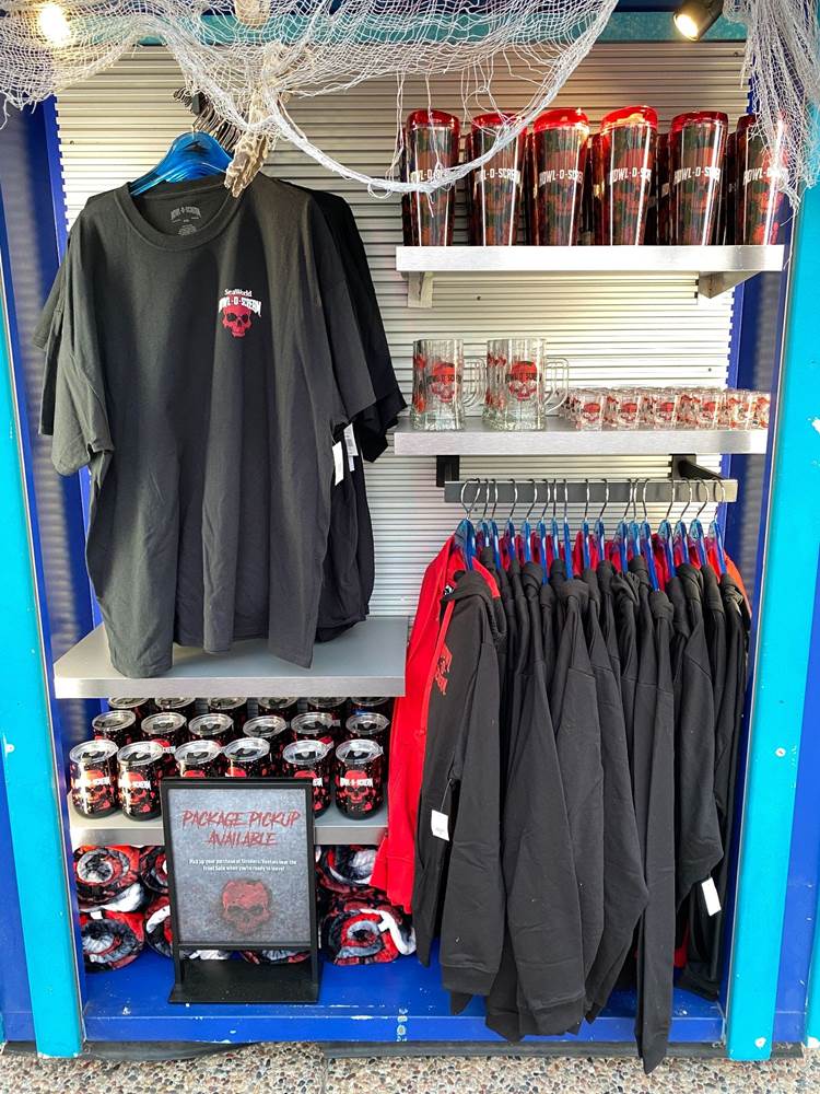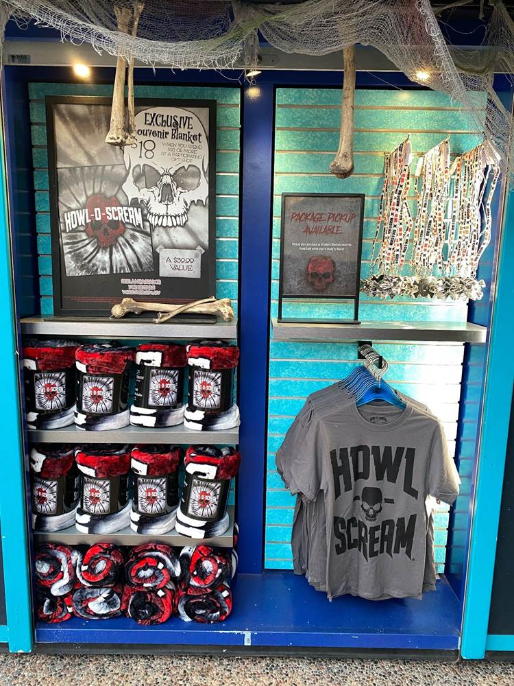 Howl-O-Scream merchandise includes t-shirts, mugs, souvenir blankets, lanyards, hoodies, and more.