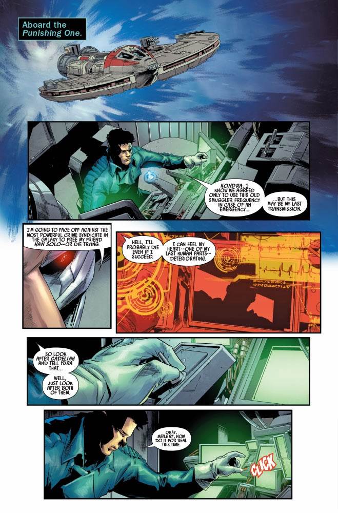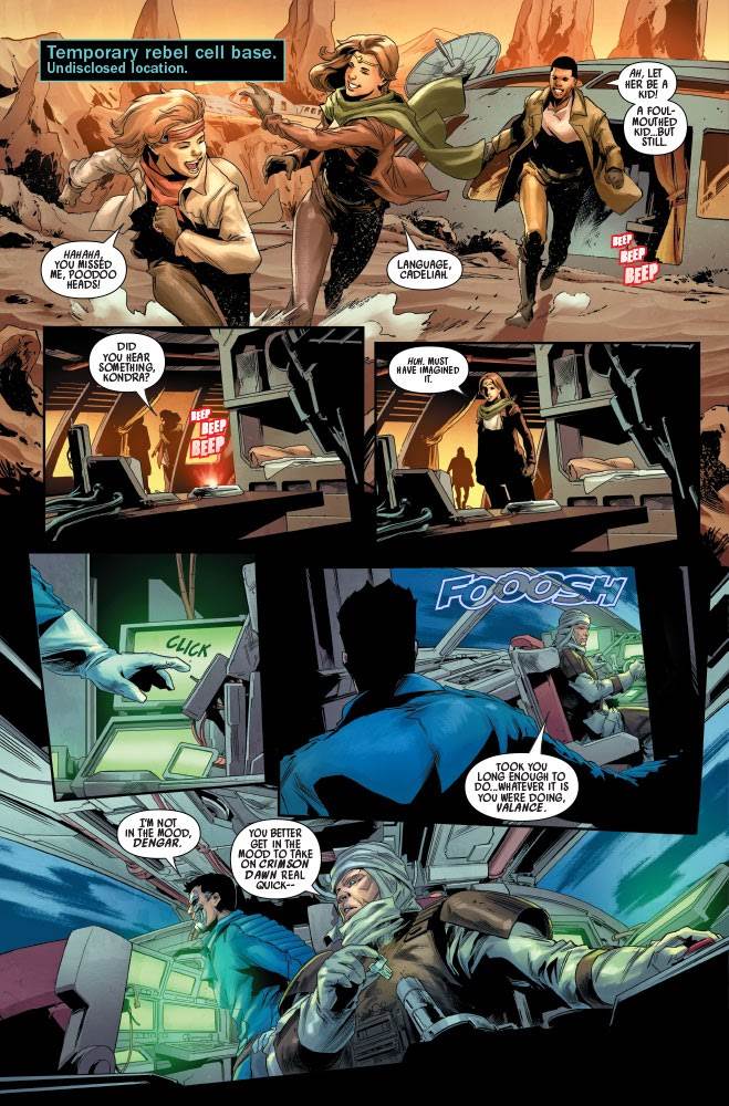 We pick up with Valance and Dengar in hyperspace aboard the Punishing One, and Valance making an attempt to reach out to his rebel friends who have adopted Cadeliah-- the star-crossed heir to both the Mourner’s Wail and Unbroken Clan crime syndicates. Then upon arriving at Jekara, they find that they are far from the only interested party in the quest for the carbonite-frozen Han Solo. And while Valance simply wants to rescue his old war buddy Han, Dengar seeks to claim the bounty on Boba Fett in an effort to save the love of his life from Jabba the Hutt. We also spend some time with fellow hunters T’onga and Losha, who have taken Zuckuss aboard their ship so he can help them track down Valance, who might be able to lead them to Cadeliah. It’s a complicated web of interpersonal character relationships, but that’s what’s starting to make the Bounty Hunters comic worth keeping up with after a period of frustrating wheel-spinning.