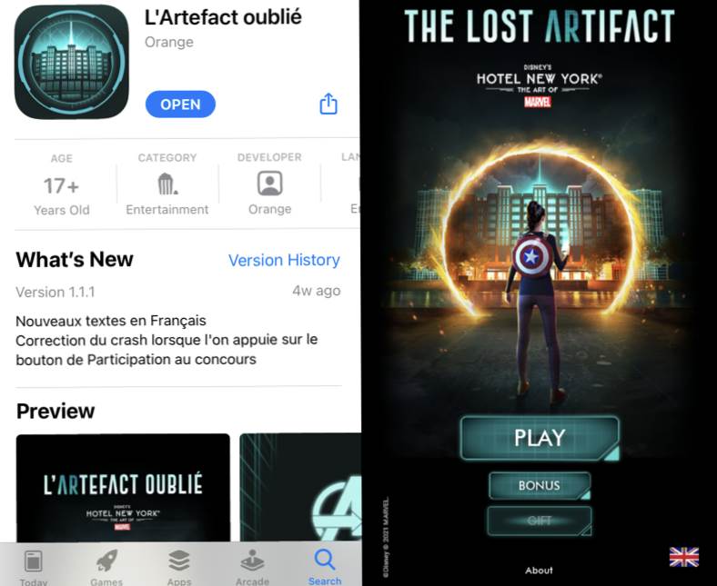 This week, the French telecom Orange in partnership with Disneyland Paris released a new app called “The Lost Artifact.” Themed to the recently-opened Hotel New York - The Art of Marvel, the application features a few fan favorite heroes and some neat tricks. After getting a chance to try out the app for myself this morning, I thought I’d share a few thoughts.
