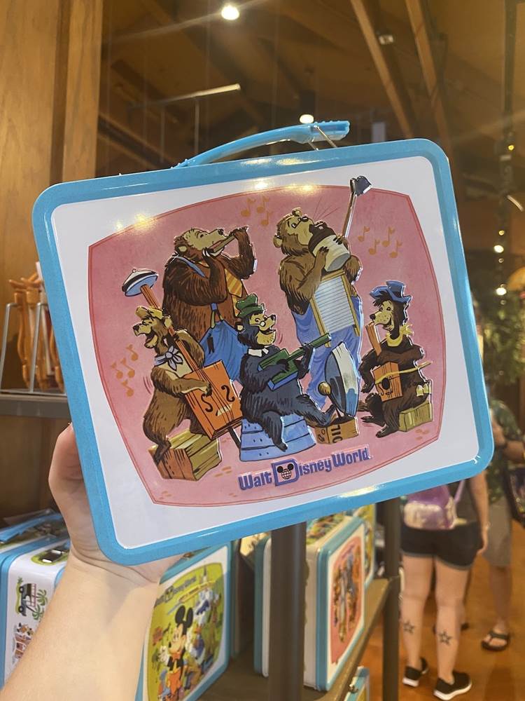Fans can pick up traditional style lunch boxes too that showcase Mickey and Friends in front of Magic Kingdom on one side and the Country Bears on the other.