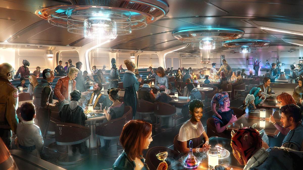 - The group also briefly discussed the high-tech interactive lightsaber training pod and the Crown of Corella dining room, where guests will eat three meals a day. At night this room transforms into a supper club with live music. They touched on the dining room’s “blue mohair upholstery” and food that “feels out of this world.”