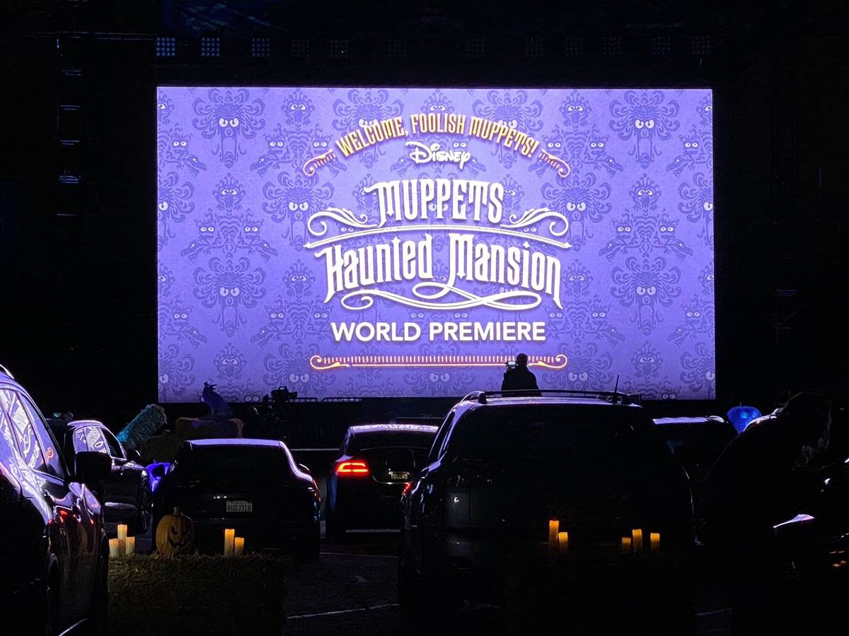 Further along the path, a marquee sign and a giant Disney+ logo announced that drivers were approaching the Muppets Haunted Mansion World Premiere screening area.
