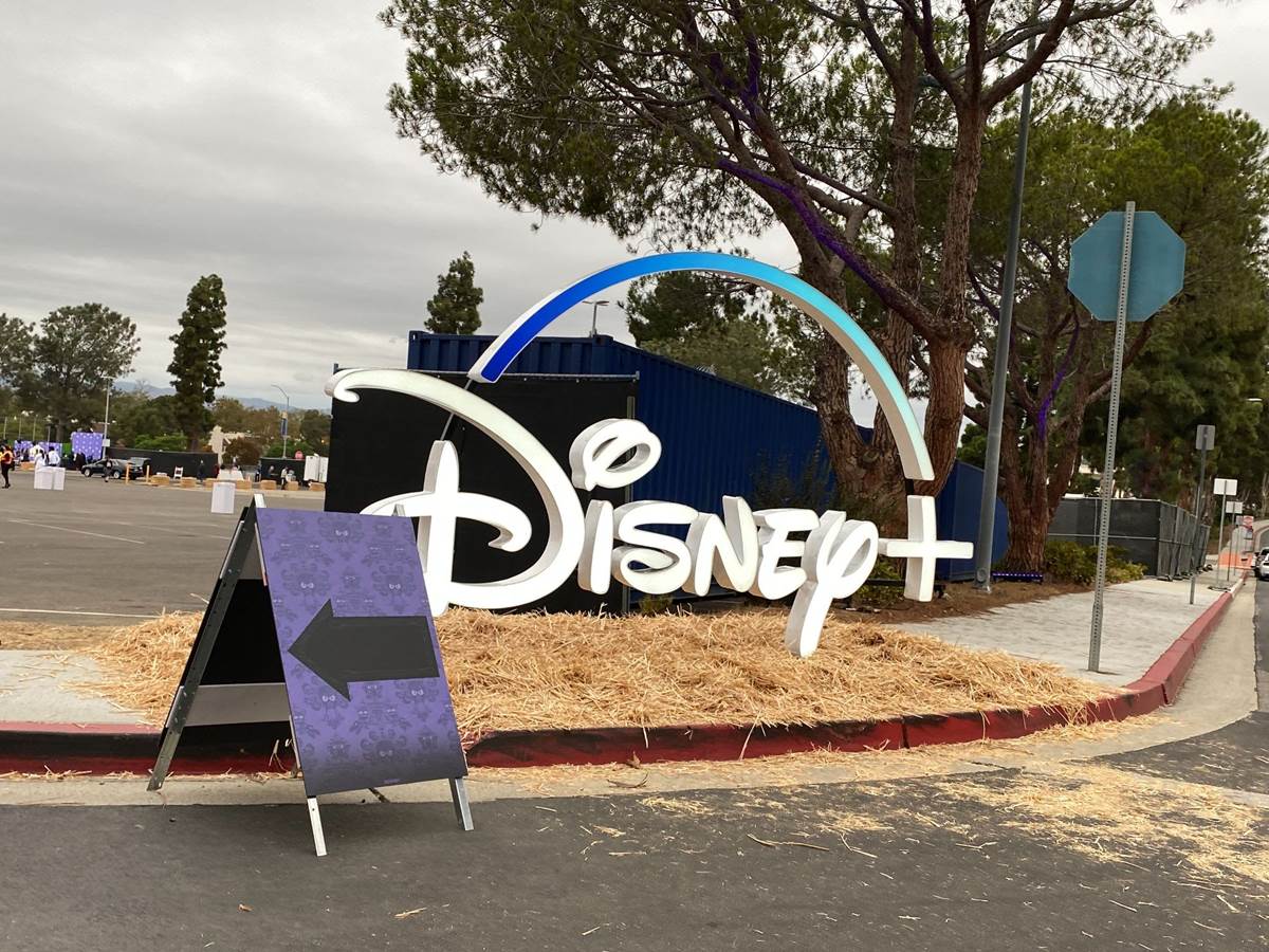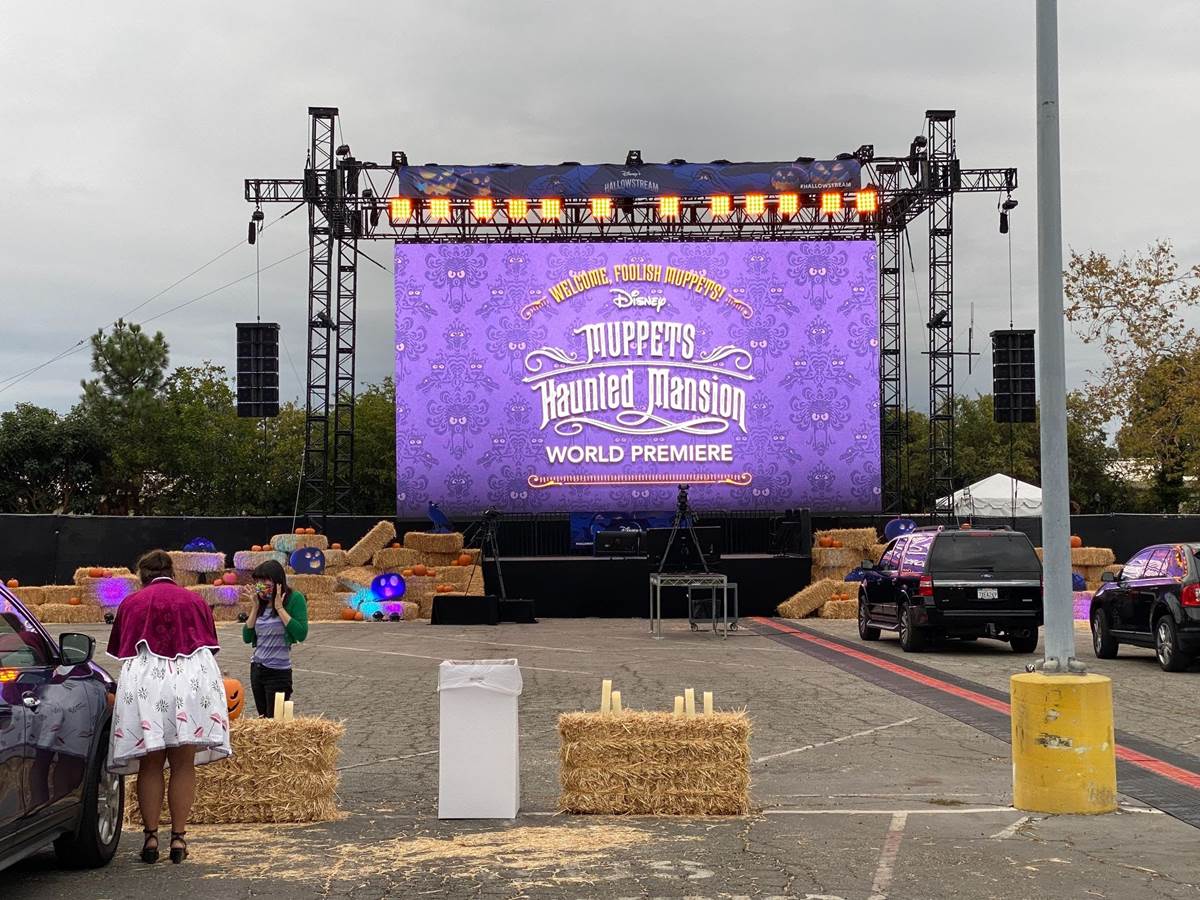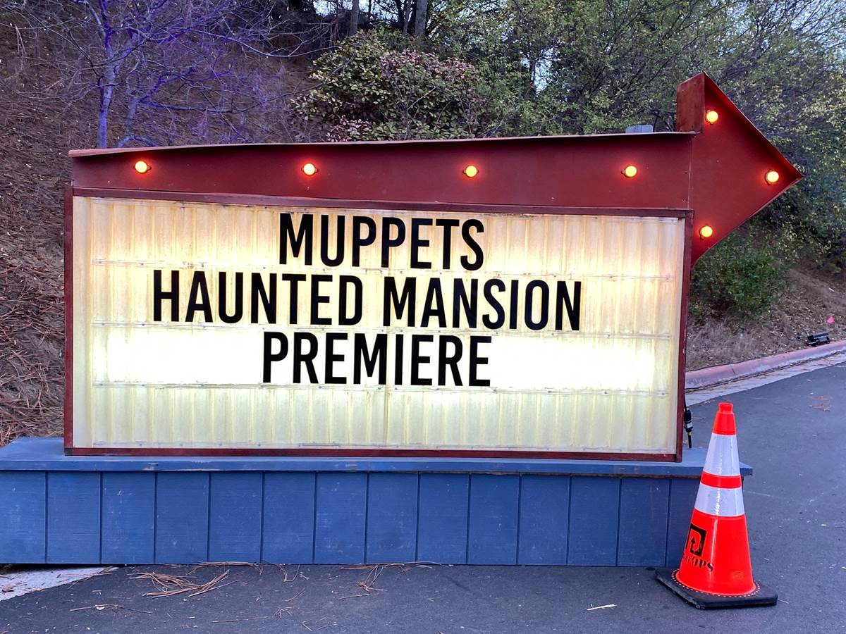 Further along the path, a marquee sign and a giant Disney+ logo announced that drivers were approaching the Muppets Haunted Mansion World Premiere screening area.