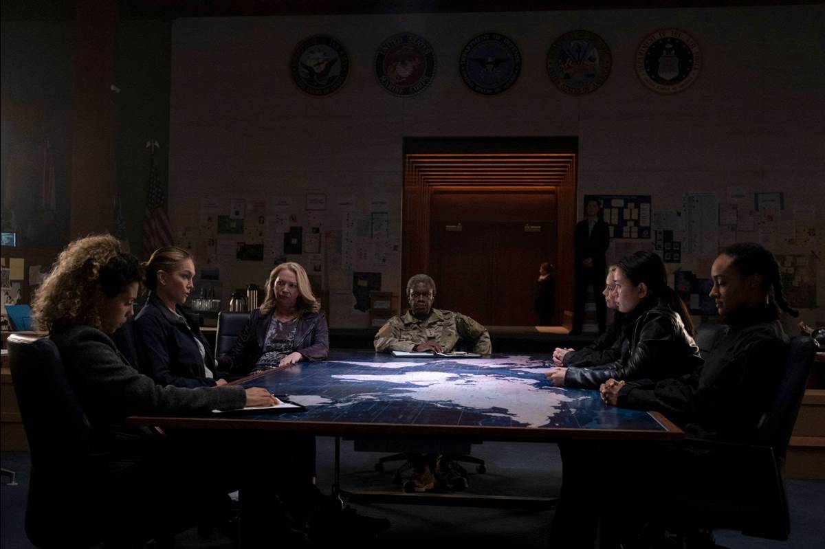 President Brown is called away to be told about a new strain of the flu that’s going around, and she tells her aide to stay with Beth. “She doesn’t know.” Christine tells Beth about life in the Pentagon: “There’s not a lot of downtime.” Beth asks if anyone could get in. “No, of course not. It’s the Pentagon,” Christine responds. Marla, still in her nightgown, storms into the briefing room: “You made me think I was crazy,” she says to President Brown. The two argue for a minute and Marla leaves. “Let’s be respectful. Let’s get back to it,” says Brown, trying to regain composure in the room. In the prison cell, Agent 355 continues tying her shoelaces together while Yorick says they probably aren’t going to survive a confrontation because of Sarah’s head wound. He challenges her to a fight so she can prove her skills, and 355 easily takes him down while Dr. Mann looks on, but Sarah ends up vomiting from the exercise.