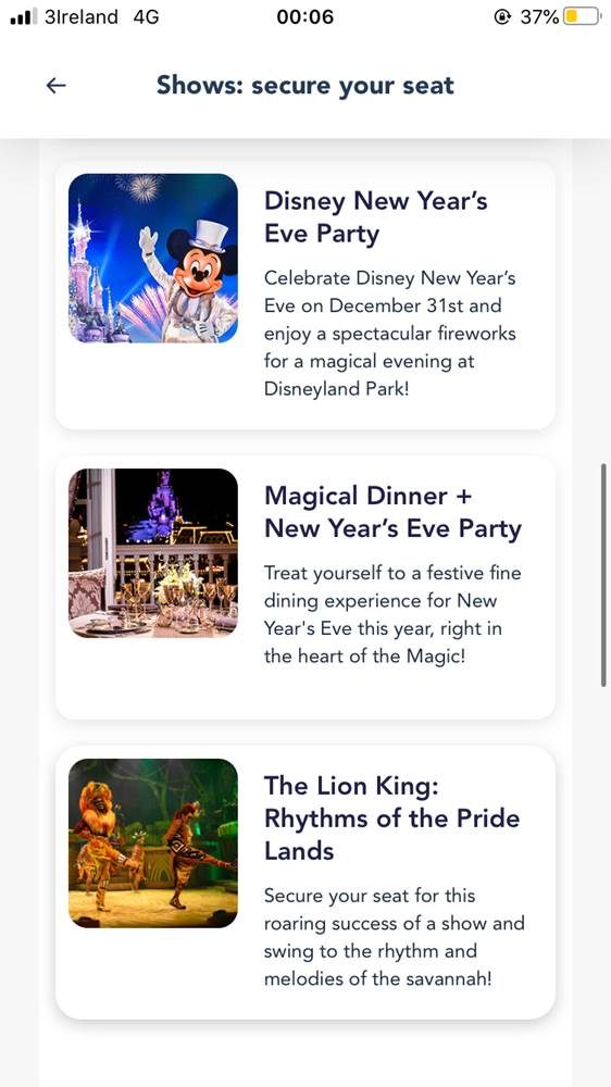 The Disneyland Paris app and website have been updated today with these new paid offerings, showcasing what could potentially become the norm for future park shows. It’s important to note that guests do NOT need to pay to enjoy the show, and this paid service is only for guaranteed access and seating. Guests can purchase tickets through the Disneyland Paris app or website (although, the app leads to the website’s event tickets page regardless).