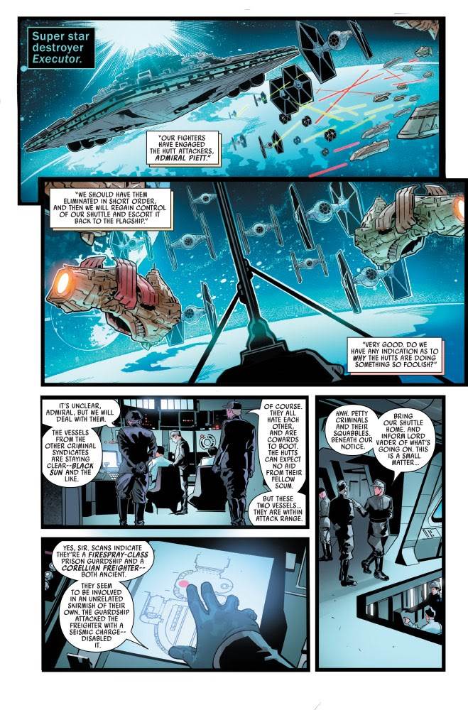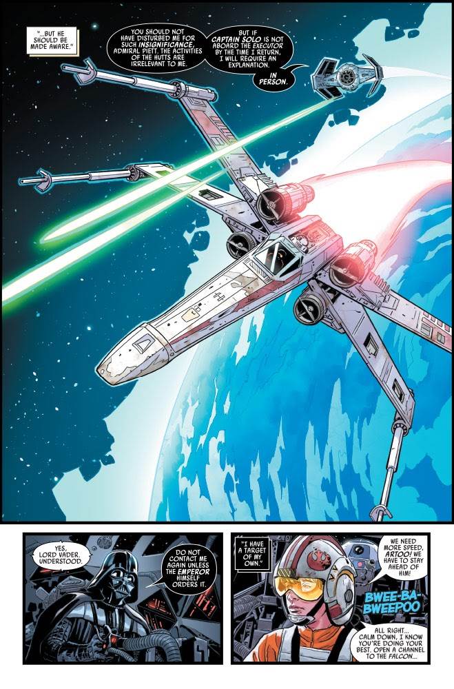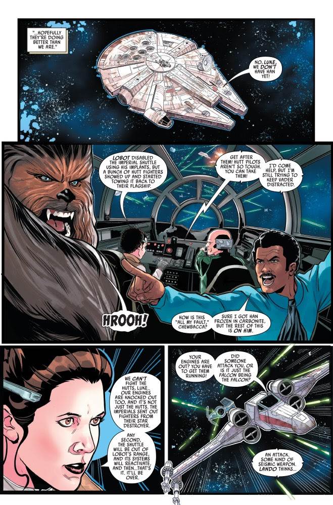 Star Wars: War of the Bounty Hunters #5– the concluding chapter in the miniseries event, entitled “Attack at Dawn”-- begins where the previous issue left off, with the Hutt council ship intercepting the Imperial shuttle that contains Han’s carbonite block, with the Millennium Falcon and Slave I watching rather helplessly nearby. Meanwhile, Luke Skywalker is still using his X-wing starfighter to lead Darth Vader around in his TIE Advanced in an effort to distract the Dark Lord of the Sith from the Rebel Alliance’s true goal in this daring endeavor: retrieve Captain Solo at all costs. Most of these interested parties wind up on the Star Destroyer Executor, with a climactic showdown between Boba Fett, Princess Leia, Lando Calrissian, and Chewbacca in the flagship’s detention level. I will give always-ambitious writer Charles Soule this compliment: the story here feels an awful lot like tales a young Star Wars might invent while playing with all of these characters’ action figures, concocting a reasonable expansion to their adventures seen on the big screen.