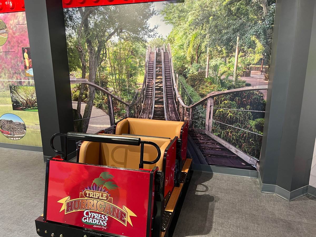 The Coastersaurus wooden coaster currently at the park has actually been around since the Cypress Garden days, when it was known as Triple Hurricane. An original car from the coaster is on display.