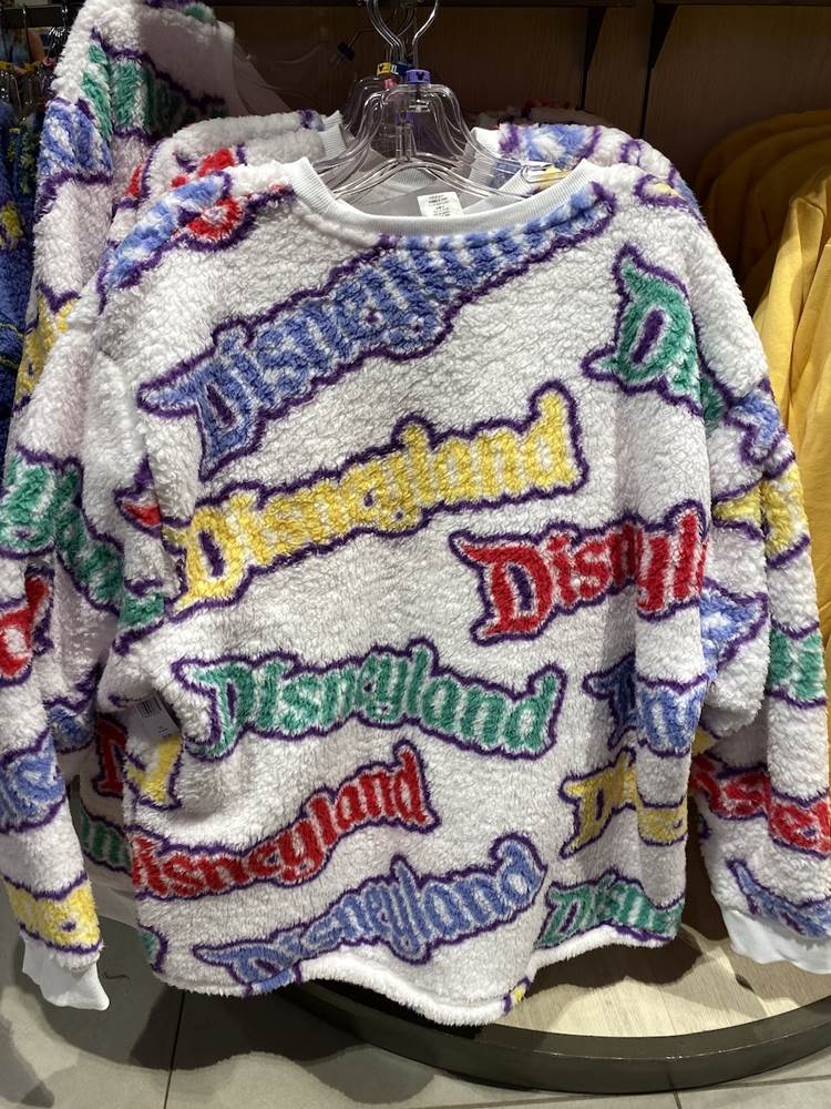And we’ve saved the best for last, Disneyland! Red, Blue, Yellow, and Green versions of the traditional “Disneyland” sign are placed all over a white sweatshirt for a simplistic but fun look that will carry the magic long after your Disneyland visit is over.