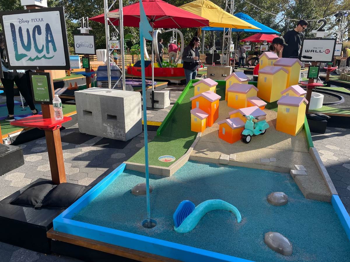 Each of the holes offers unique challenges and the experience begins with the most recent Pixar film, Luca. Starting on the Luxo Ball, players have to put their ball through the hilly streets of Porto Rosso, into the ocean and around a sea monster’s tail.