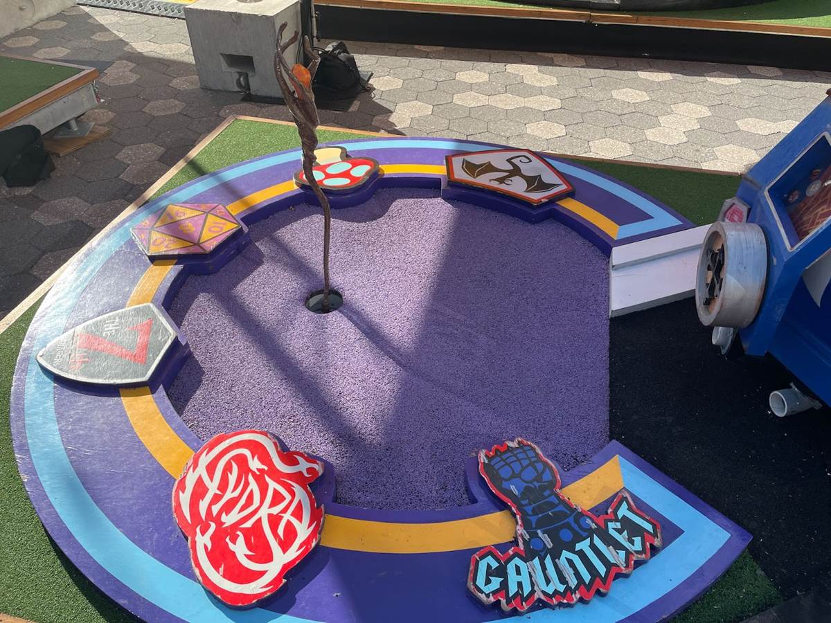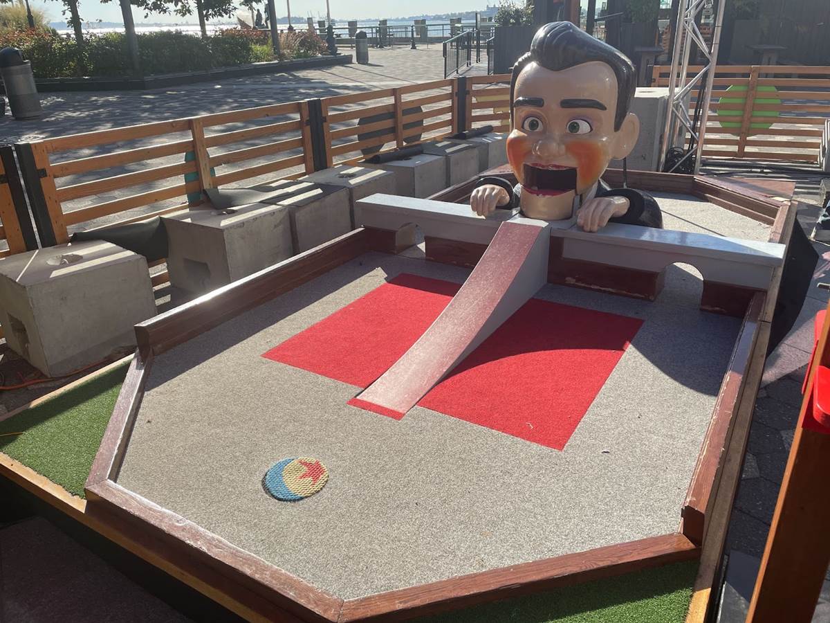The first of three Toy Story themed holes comes from the antique shop in Toy Story 4 with one of Gabby Gabby’s Bensons blocking the way. His mouth raises and lowers, but if you can sail the ball into his open mouth, you can possibly achieve a hole-in-one. There are two holes on the sides if you’re just trying to get under par, but the shape of the course makes it possible to send the ball back around through the other opening if you’re not careful.