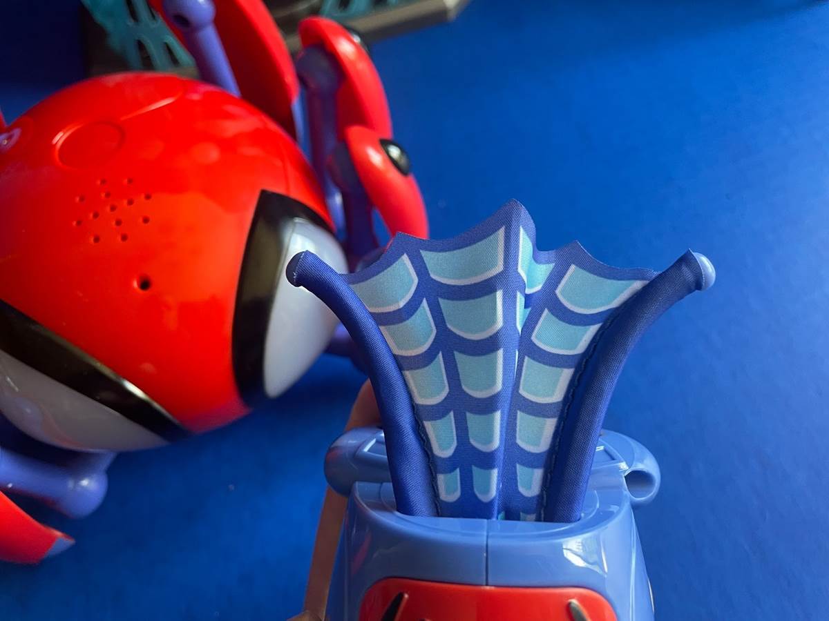 The actual web is about 2-inches long and made of fabric with plastic sides, ensuring that nobody can be hurt on the receiving end of the action. They are retracted by default and pressing the yellow button on the end thwips them out.