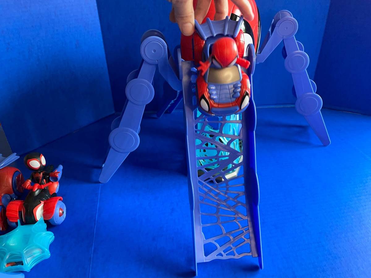The biggest of the toys is the Web-Quarters Playset, which comes with a Spider-Man figure and vehicle. It features lights and sounds and has moving parts that allow the Web-Quarters to open and close. At $62.99, it’s also the priciest piece in the collection.