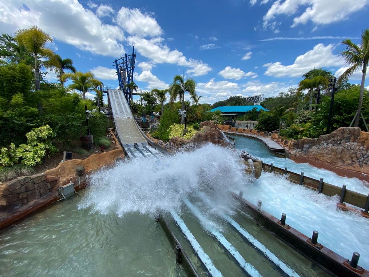 One of the newest attractions at SeaWorld Orlando is Infinity Falls, perhaps the best river rafting ride in the Orlando area. The theming is pretty minimal, however there is a lot of beautiful landscaping in addition to flamingos on display at the start of the ride. Things start off with a fun rapids section featuring some slight, but sudden drops. You then go up a regular lift hill, through more rapids, and then up a vertical lift and down one of the biggest drops on any river rafting ride in the world. Be forewarned though, you will get very wet!